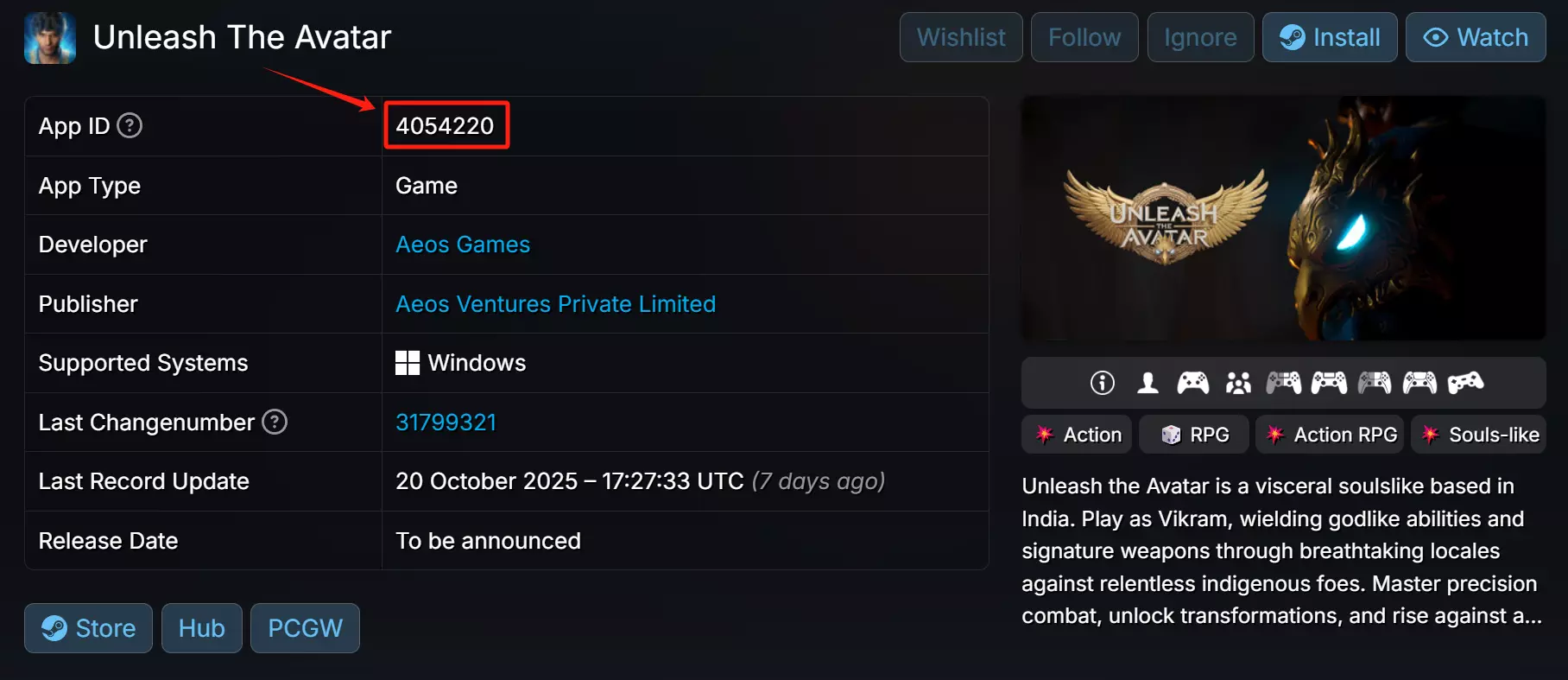 具体操作演示 为了方便复现演示效果,接下来的步骤基于Unleash The Avatar这个游戏和这一条动态内容做演示 STEP0: 准备事项 Google chrome 或 Edge 或能打开控制台的浏览器 STEP1: 获取你想要关联的游戏的appid 你需要在steamdb中查找这个游戏的appid 点击这里就是Unleash The Avatar的steamdb页面信息,你可以在这个页面搜索别的游戏然后记录id
