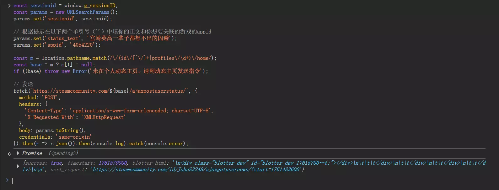 步骤3:复制以下代码,根据提示将里面的两个字段替换为你刚刚获取的appid和想要发布的动态正文。你可以提前编辑好内容,更换自己的id和内容,然后准备粘贴,或者粘贴到浏览器控制台进行编辑后按回车发送 const sessionid = window.g_sessionID; const params = new URLSearchParams(); params.set('sessionid', sessionid); // 根据提示在以下两个单引号('')中填你的正文和你想要关联的游戏的appid params.set('status_text', '这里填你状态的正文'); params.set('appid', '这里填appid'); const m = location.pathname.match(/ /(id /[^ /]+|profiles / d+) /home/); const base = m ? m[1] : null; if (!未在个人动态主页,请到动态主页发送指令。然后回到刚刚的控制台界面,粘贴,回车。看到success:true这个字段就说明成功了。