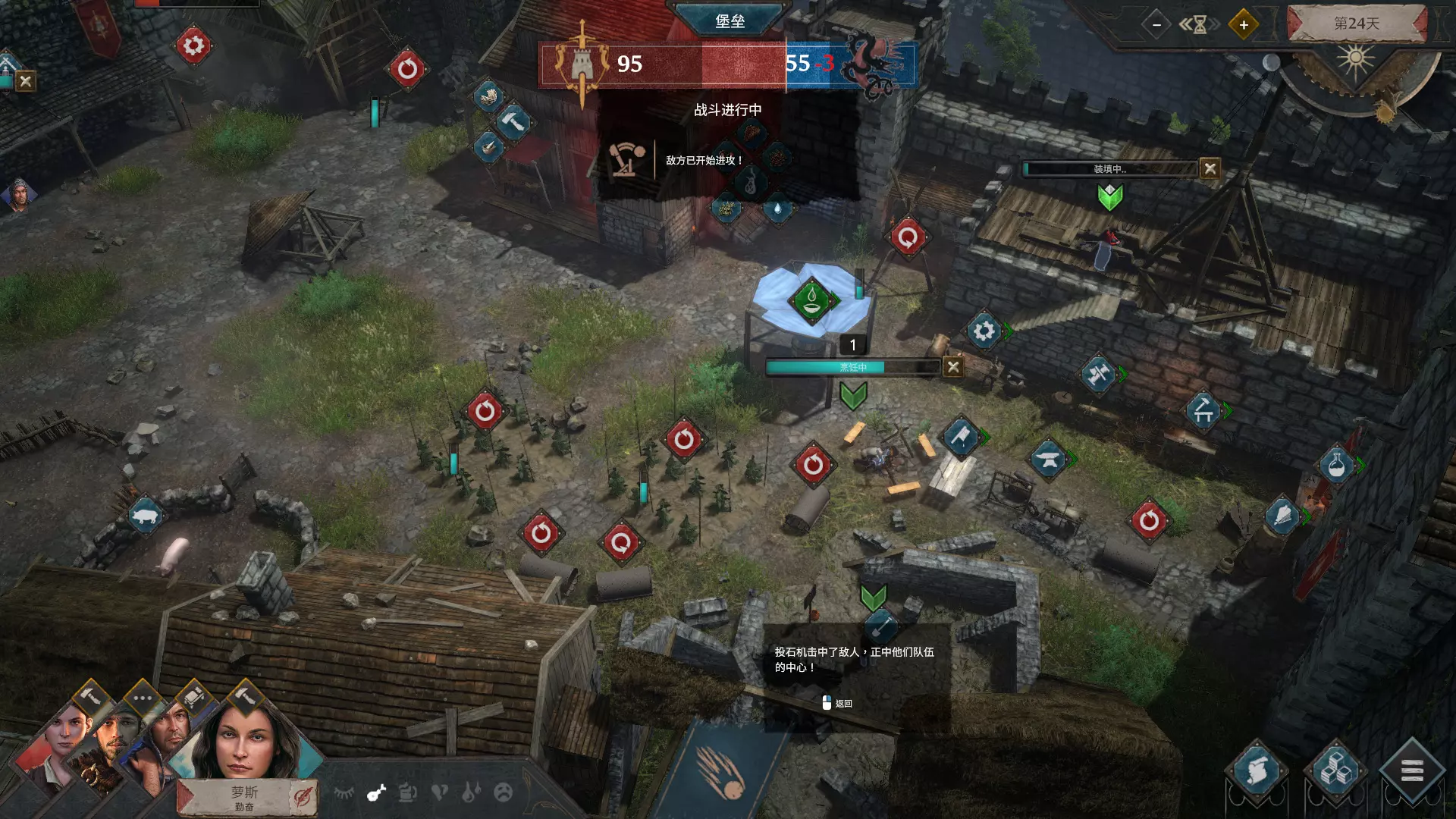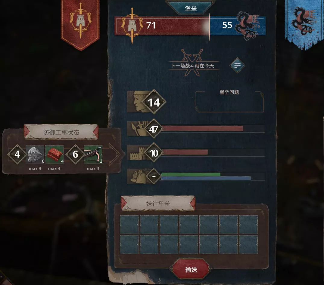 投石机需要焦油,焦油需用罐子到焦油岛灌装,每场战争使用投石机需消耗3罐焦油(每次1罐)。使用3次投石机后,投石机会损坏,需消耗材料和木板进行修理。每次投石可使敌方战力减3,提升制作和角色装填速度可加快投石效率。 成就指南 除通关指定模式的成就外,大部分成就可在一局游戏流程中获得。以下主要介绍部分有难度的成就: 解锁所有可玩角色:在故事模式中共有7个角色成就可解锁,角色招募位置已在上述章节中说明。若想在一局游戏中解锁7个角色,需在未招募第四个角色前前往地图上的对应位置完成对话,因为招募满员后其他角色的感叹号会消失。 屠夫。在一晚上杀死3名敌方卫兵:使用带有战斗技能的角色携带一把武器出门,专门在夜晚蹲守并击杀卫兵。 寻宝猎人:找到并收集整个场景中的所有可用宝箱,整个地图共有10个宝箱,其位置在不同模式下有所不同。在叙事模式中宝箱较容易寻找,外观明显。 逆势而上:需要为士兵提供人数两倍的食物,以提升他们的实力。要在后期开战前提前准备好约30个熟食并运输给士兵。 他们休想通过:堡垒实力达到75分,同时可获得另一个50分的成就。要达到75分通常需在20天后,准备充足的武器,包括7把以上的剑以及所有的弓和箭,且之前的战争需实现有效防御,砖块上限不低于6。 最终胜利维持稳固防御,且援军彻底击溃敌人。需要在前面的战争中发挥良好,最后一场战争中实力远大于敌方取得胜利,这个成就可以和【逆势而上】和【他们休想通过】一起完成。