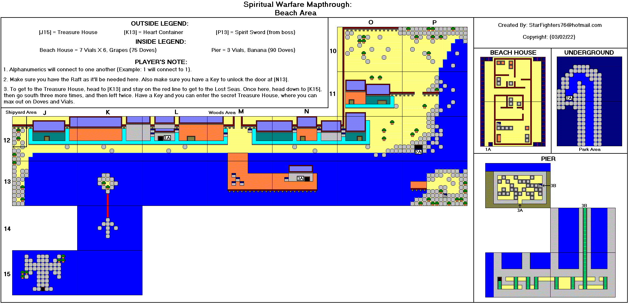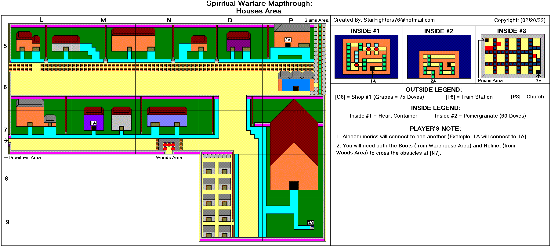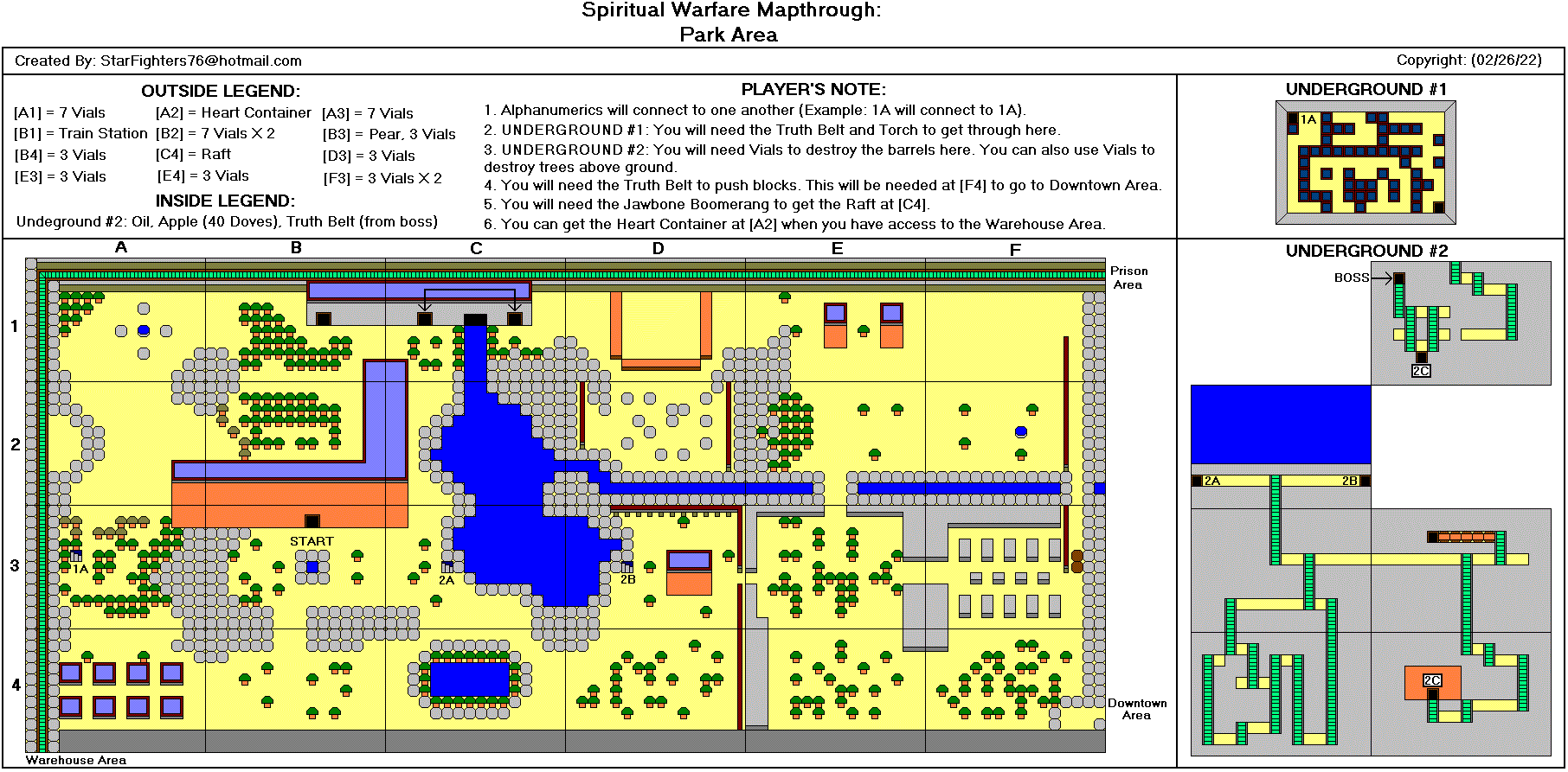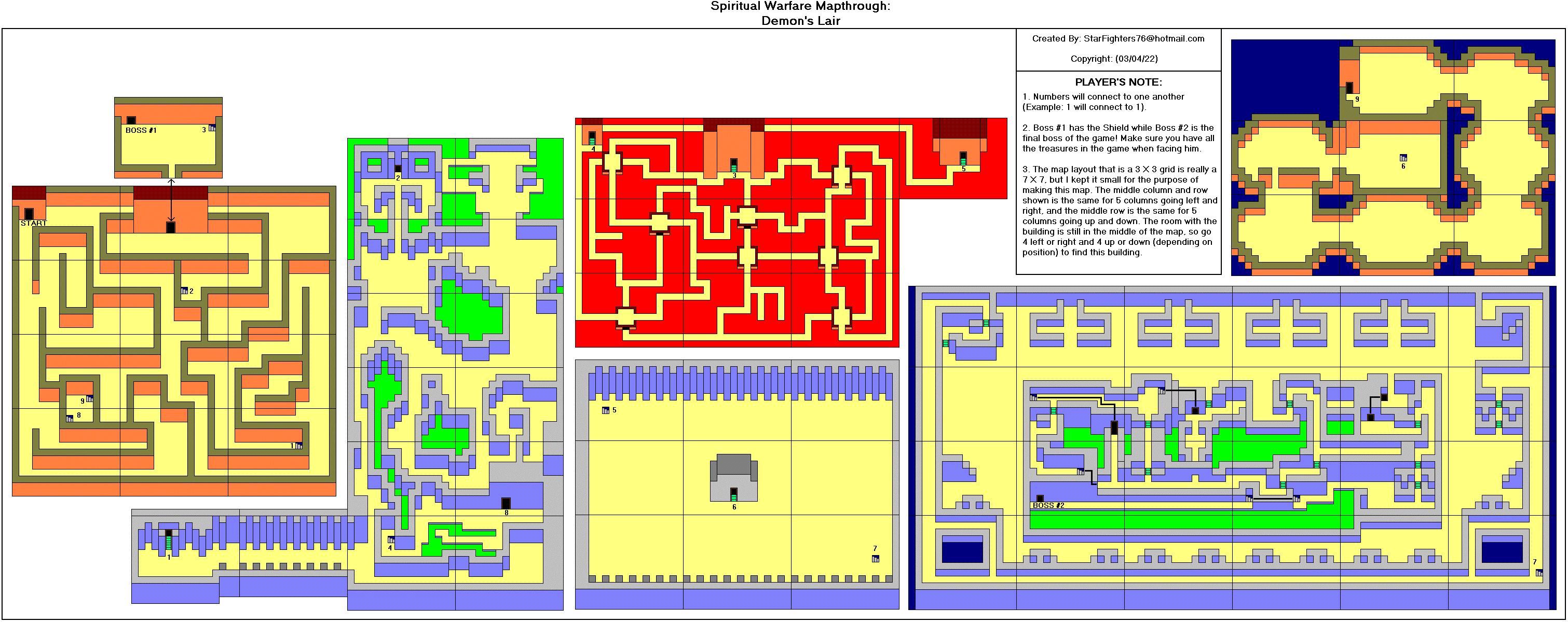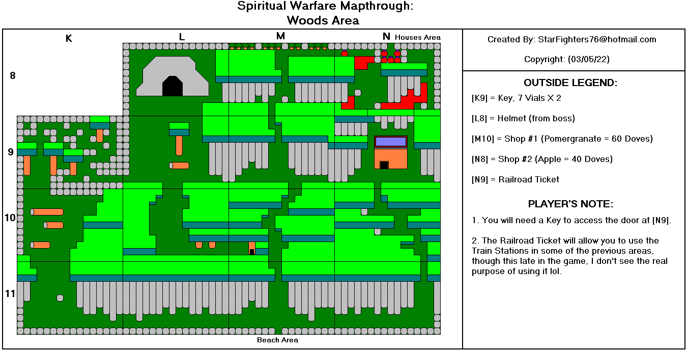 @-起点 *-心之容器 J-参孙的颚骨 P-梨 A-苹果 M-石榴 G-葡萄 B-香蕉 R-木筏 K-钥匙 F-火炬 1-首领房间1(真理之带) 2-首领房间2(胸甲) 3-首领房间3(战靴) 4-首领房间4(救恩之盔) 5-首领房间5(圣灵之剑) 6-首领房间6(信心之盾) D-恶魔要塞(最终首领房间) T-火车站(需要铁路票) #-铁路票 C-教堂 $-当铺 额外地图来自luigimcloud