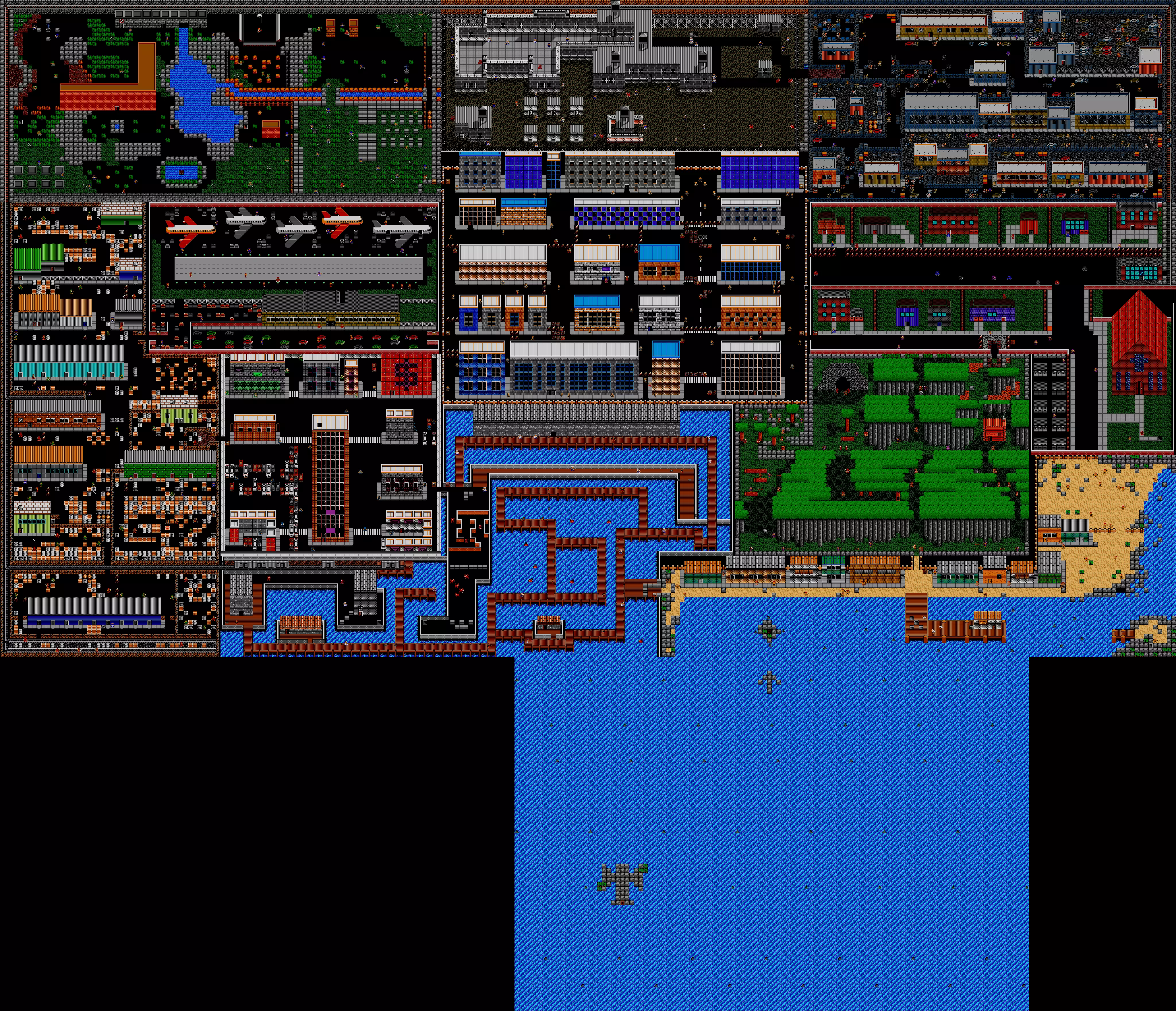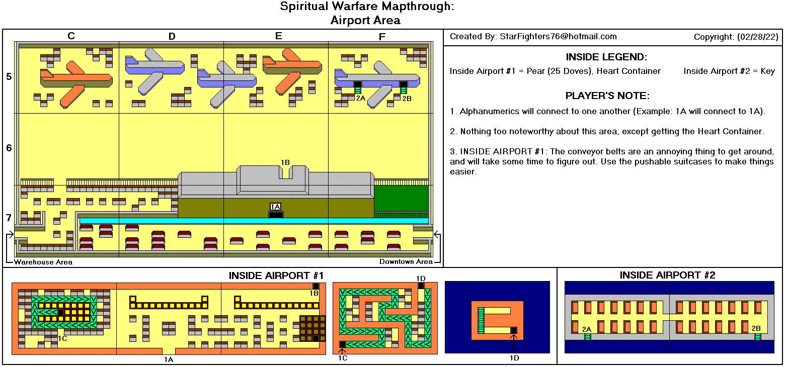 在C,6的房屋内有一个心之容器。 D,6处是森林的入口。目前请远离森林,因为你需要头盔和靴子才能继续前进。 在屏幕E,7处,进入右下角的车库(四个车库中的一个),你可以用75点SP购买葡萄。 F,8处有一条通道,可通往9,0的监狱。暂时避开此处。 教堂位于F,7。在祭坛处,你会得到下一步行动的建议,并且能量会被充满。你可以随时访问教堂,当你在游戏中陷入停滞时,他们总会为你提供线索。 F,5处有一个火车站。 在F,4处,你可以用60点SP购买石榴。 现在再次返回市中心(B,6),并进入6,6处的机场。 攻略05 机场