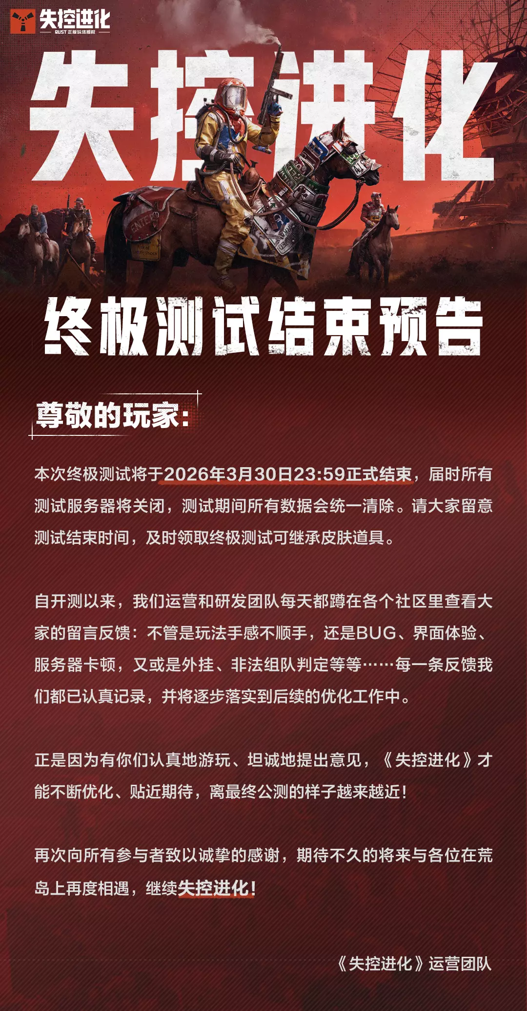 接下来,我们将继续打磨游戏的内容与品质,期待不久的将来和大家再次重逢,继续一起失控进化!再次向所有参与者致以诚挚的感谢!