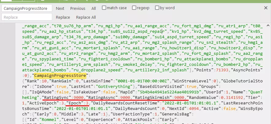 e) 我们通过快速搜索(CTRL + F)查找“CampaignProgressStore”,并在其中找到“RatingSync”“RatingAsync”“RatingSkirmish”这几个词。给每个词对应的数值都加上9000。这样我们就能提升等级以进入第三纪元; f) 要开启第三纪元本身,只需给“Epoch”一词对应的数值加上3。