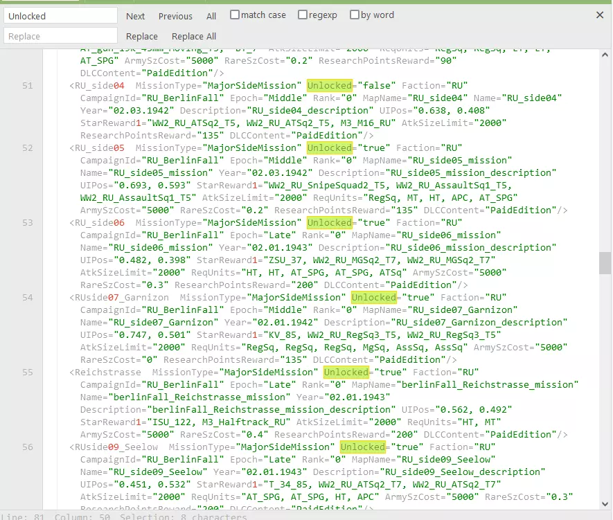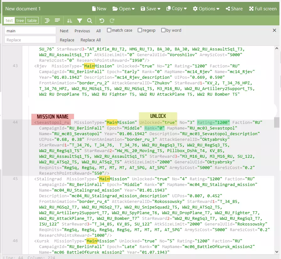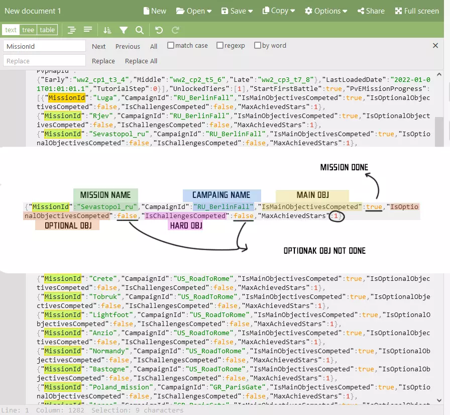 b) 将内容复制到JSON编辑器中,以便于搜索和编辑; c) 通过快速搜索(CTRL + F)找到“MainMission”一词。其后面的首个词汇即为游戏主线任务的名称; d) 在此处,不要忘记解锁任务。在“Unlock”项中,只需将其设置为“True”。