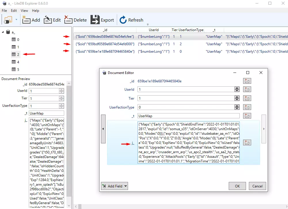 现在为那些想要自行编辑所有内容的玩家提供说明: a) 为方便编辑文件,你需要使用JSON编辑器。 b) 要编辑文件,我们需要LiteDbExplorer,你可以从原作者处获取。 现在开始编辑步骤: 1. 如何解锁所有时代: 1.1 等级提升。 a) 启动LiteDbExplorer; b) 在其中打开来自“Blitzkrieg3 Data User_”文件夹的“a_”文件; c) 在左栏中找到数字2,右侧会有三行内容,这三行代表阵营; d) 双击打开编辑,搜索“_j”。将“_j”的内容复制粘贴到JSON编辑器中以便轻松编辑