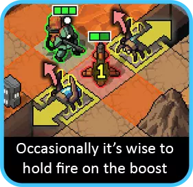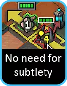 当你打开机库时,散热装置看起来相当糟糕,直到你发现了最后也是最关键的要素:火焰带来的【强化】。【强化】是一项新加入的机制,能让你的下一次攻击额外造成1点伤害。它不会失效,如果你不进行攻击,也可以将强化留到下一回合使用。