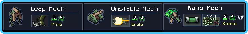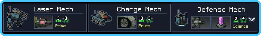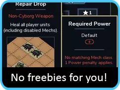 正如你从名字中可能猜到的,危险机甲能够造成相当沉重的伤害。不幸的是,你可能也从名字中猜到了……“它们自己”和“其他所有东西”也包括在上述伤害范围内。 这又是充能机甲的翻版,只不过现在你有两台。唯一的慰藉是它们在达成击杀时会治疗自身,所以如果你一开始优先选择有更多脆弱敌人的岛屿,并避开能提升护甲的普西隆,应该就没问题。另外要仔细选择关卡,因为涉及阻挡出现的维克斯或限制机甲伤害的任务,不出所料会更难。不过值得庆幸的是,已治疗的伤害不计入你的任务目标。