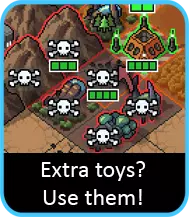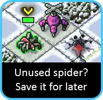 这才是乐趣所在。不过先别太激动,要记住这个攻击只有1点伤害,而且不会造成击退……所以要是没能击杀敌人,你基本就等于白忙活了。 但要是用这一击成功击杀了敌人,你就能得到一只属于自己的玩具蜘蛛来操控!它可以立即移动,并且能进行1点伤害的攻击加推击。虽然它只能攻击一次就会死亡,但不像炸弹小子那样在回合结束时就消失,所以如果暂时用不上,你可以把它们留着。一般来说,一旦你有了蜘蛛,它们就能帮忙削弱敌人,进而制造出另一只蜘蛛……如此循环。要是能保持这种势头,你就等着乐吧。
