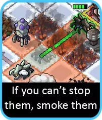 它的机动性不如你的大黄蜂,所以要抓住容易攻击的机会。值得庆幸的是,与 vek 版本不同,你不会受到水的阻碍,所以如果它在你的冲锋路线上,不必惊慌。尽管它的冲锋能让它移动很远的距离,但尽量让它靠近战斗区域,这样如果需要的话,更容易从侧面夹击。 烟雾升级看似没什么用,但实际上对于第二座岛屿及以后非常重要。无论你怎么努力,最终都会遇到难以轻松消灭的 vek。烟雾是你拖延它们足够长时间的王牌。如果你有幸能用烟雾笼罩一个 vek,同时攻击另一个,这也能为你争取喘息的空间。尽可能抓住这些机会,这会大大减轻其他方面的压力。幸运的是,在你经常身处激战的地方,这种情况应该会更频繁地出现。
