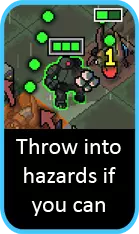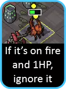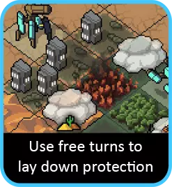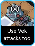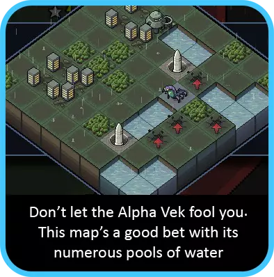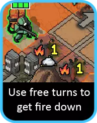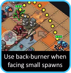 如果你要对付任何重型单位(尤其是领袖级维ek),尽快让它们着火非常重要。实际上,如果你能做到:用流星机甲对其施加燃烧效果,这样火焰机甲就能在第一回合开始造成额外伤害。 让战场上布满火焰是个不错的策略。如果有空闲回合,就开始到处纵火。建筑物旁边的格子或任何维ek即将出现的格子都是绝佳目标。使用火焰时还要记住,任何只有1点生命值且处于燃烧状态的单位都会在本回合被消灭——即使有灵能再生效果也不例外,所以不用浪费时间专门对付它们。
