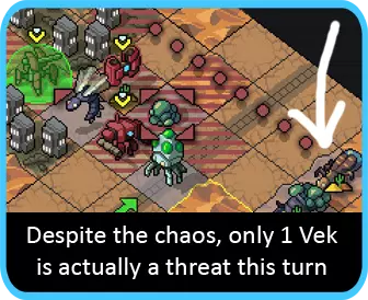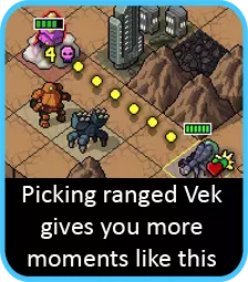 通常来说,一般回合的思路似乎都是“我这回合该怎么用我的机甲?” 但在这里,我们换个角度。你要做的是观察 vek,问问自己“我需要把它推到哪里?”或者“我需要造成多少伤害?”一旦想清楚这些,接下来的问题就是“我的机甲需要处于什么位置才能做到这些?”然后是“我如何让它们到达那里?” 这种有条理的方法对于应对特别棘手的回合通常非常有用。而且这也不是只问一次的问题。一定要考虑到你不同的机甲以及它们各自拥有的各种能力。 我最喜欢的一个例子就是在一次闪电战玩法中。一只阿尔法维克斯正在威胁一个目标,而且没有任何单位能够在不破坏目标的情况下触及它。奇妙的是,解决办法是用我的钩爪机甲将我的火炮机甲拉到地图的一半位置——这样火炮机甲就能移动到所需的攻击位置,从而将维克斯推开。 推论:如果你陷入棘手的局面,另一个好策略是先找出那些你别无他法只能执行的行动。