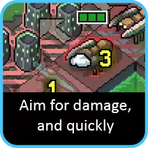 把 vek 推来推去确实不错……但除非你真的能清理掉场上的敌人,否则最终还是会被数量庞大的敌人淹没。因此,你应该始终优先击杀 vek,而不是仅仅让它受点轻伤。留意水域、障碍物……任何能一击消灭 vek 的东西都是好的。 出于这个原因,你也不应该在伤害升级上吝啬。花 2 - 3 个核心来增加一点额外伤害可能看起来很傻……但这往往就是能否击倒 vek 和被迫在下一回合处理它之间的区别。这样的好处怎么强调都不为过。 如果你足够幸运,有一两次空闲移动,而你的机甲不需要处理任何紧急事务(比如)当所有即时威胁都已解除时,与其分散火力削弱多个 vek,不如集中火力消灭单个 vek。即使某个 vek 在本回合没有威胁任何目标,只要有能力,就向它发射火箭吧。就算没别的好处,飞行员们也能借此练练手。 明智购物