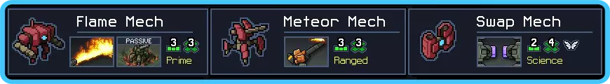 这是你的主要伤害输出单位……不过这么说其实不太准确,因为它实际上并不造成直接伤害。 它有两个主要功能。首先,对于任何未被点燃且威胁到建筑的 vek,你都需要派它上场。它的优势在于能够推开敌人并将其点燃(这是流星机甲做不到的),因此是消耗敌人最可靠的方式。其次,它可以攻击任何已经燃烧的重型单位。你对这些单位造成的伤害会有加成,所以一旦开始出现领袖级 vek 和阿尔法级 vek,它就成了必备单位。