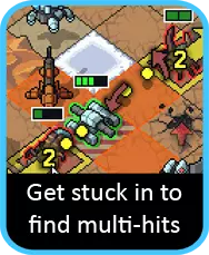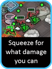 需要特别注意的是,与大多数其他火炮不同,三联火箭可以瞄准相邻的格子(例如,当你被跳跃者用蛛网缠住时就非常有用),而且如果你瞄准的是边缘区域,可以将火箭数量缩减为两枚,以防击中任何有价值的目标。 考虑到它会攻击一整行三个格子(严格来说还会将最后一个目标推到第四个格子),友军误伤似乎是个棘手的问题。如何应对这一问题最终取决于关卡和 vek……大多数情况下,采用经典的后排部署并左右移动的方式实际上就足够了。不过,如果 vek 很可能卡在重要目标之间,那么将其部署在更中心的位置会为你提供操作空间,以便在需要时从侧面将它们驱离。