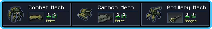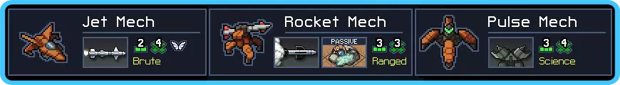 再次体验 siege mech 的乐趣。怀念吗? 尽管会造成附带伤害,跳跃机甲的用途还是相当广泛的。它的跳跃能力意味着你能从容应对地图上的大多数威胁。更大的挑战在于保住它的性命,因为它的伤害输出不算太高。所以,最好让它去解决那些容易的目标:跳跃型 vek、水中的 vek 或者将 vek 撞向彼此。生命值升级也很有用,尤其是在你的伤害得到提升之后。 如果必须选择副武器,跳跃机甲也是更好的选择,因为在敌人密集的关卡中,跳跃的范围效果可能会让你非常头疼。不过,它的用法和 siege mech 很像,但凭借不错的移动速度,你可能会更容易找到安全的着陆点。