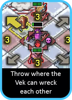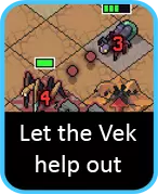 如果你无法仅靠机甲消灭所有 vek,不妨看看 vek 本身是否能帮上忙。也就是说,当你移动一只 vek 时,能否让它顺便解决另一只?这通常通过两种方式实现: 第一种是让一只 vek 直接阻挡另一只的攻击。这对甲虫、萤火虫或蜈蚣这类直线攻击的 vek 非常有效。如果你能将另一只具有威胁的 vek 推到它们的攻击路线上,就能通过一次移动成功解决两只。 第二种是让一只 vek 的攻击在轮到它行动前就杀死另一只。不过你需要密切注意行动顺序,显然要让关键的那只先发动攻击。这种方法虽然较难实现,但在某些情况下可能成为制胜关键。