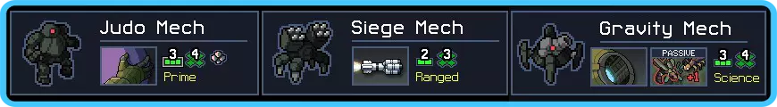 与之前的其他队伍相比,谨慎选择岛屿和战斗可能会决定你的游戏进程成败。因此,尽量选择有大量自然 hazards(危险地形)的关卡,理想情况下是那些没有密集建筑排(尤其是前排的成对建筑)的关卡。你很快就会发现攻城机甲……有点不分青红皂白。 目标要点: 这里的游戏目标就是造成伤害。你拥有一系列不错的移动能力:推、拉、投掷……关键在于完成击杀。做到这一点,你就能掌握窍门。理想情况下,你会为柔道机甲和重力机甲获得新装备。 此外,还要阻止攻城机甲摧毁你珍视的一切。