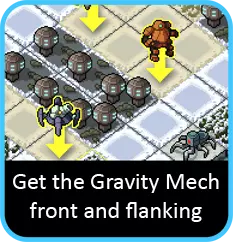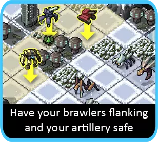 掘地维克斯是最适合利用的单位之一。只需将其部署在上方并持续攻击。这样你既能脱困,又能阻止维克斯在下一回合出现。攻击维克斯也是常见的脱困方法,因此选择有萤火虫、甲虫和蜈蚣的关卡是个不错的选择。说到这里,要记住冰层本质上起到护盾的作用。所以如果有任何目标攻击你,不要急于反击——它们可能正是你需要的破冰工具。如果你的镜像机甲正在附近攻击敌人,撞击也是个好方法。 所有这些方法的共同点是它们都围绕前线展开。因此,对于 artillery(火炮机甲)来说不同寻常的是,你需要让它参与到战斗中。吸引火力是确保你有办法脱困的最佳方式之一。至少你还能飞,这让事情简单多了。也尽早提升你的移动能力,以确保你有足够的活动范围。