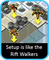 这款机甲的独特额外能力是,其火箭发射后会在身后留下一个方形烟雾区域——简直就是在给自己“掩护屁股”!虽然这看似无关紧要,但实际上它往往能成为救命稻草。如果你被蛛网困住,或者有黄蜂从后方偷偷靠近,你可以朝另一个方向发射一发火箭,让烟雾阻止它们的行动。其伤害也足以摧毁跳跃者、蜘蛛幼虫或炸弹……所以这是个很棒的备选方案。还要时刻留意能否同时达成两种效果:发射火箭撞击前方敌人,同时用烟雾阻挡身后的敌人。 因此,你不应该像对待裂隙行者的火炮机甲那样,严格地把火箭机甲放在队伍后方。在激战中,它相当实用,因为你有更大的机会一次性干扰两个敌人,而且它的【屁股云】在受到攻击时能提供一些保障。