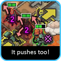 归根结底,它的作用是为你的队伍创造击杀机会。如果条件允许,先削弱大型维克斯虫,看看能否在本回合将其一击秒杀。另一个常用战术是通过推动敌人,让跳跃机甲能够一次性攻击多个目标。当然,这并不总是那么容易,因为通常需要多台机甲集火同一个敌人。当你分身乏术时,只需用它推开有威胁的维克斯虫(尤其是未被酸液攻击的)……我知道你想在本回合就消灭它们,但没关系——下回合它们会更脆弱。这同样令人满足,对吧? 在战场上