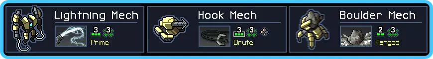 奇怪的是,需要特别留意蝎子。它们有3点生命值,你很难一击将其消灭。如果没有新装备,闪电机甲很快就会变成累赘。钩爪机甲表现不错,但能力有限。如果可以,在为闪电机甲配备更多战略选择之前,尽量避免保护任务(比如保护坦克、卫星、布雷车)。否则,你要保护的目标很可能会变成焦黑的残骸。 目标: 一切都是为了给闪电机甲寻找装备。即使强化了它的基础攻击,最终战斗中你理想情况下还需要其他装备。长矛、拳套、推进器……只要能造成推挤效果,都很不错。 理想情况下,钩爪机甲也需要一些装备。提升那台机甲和巨石机甲的生命值也非常重要,因为如果它们成为闪电链的一部分,你肯定不希望它们被瞬间摧毁。