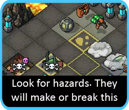 尽管在商店中只占一小部分,但游戏中最有价值的物品之一就是核心。用于启用新武器的资源,就无法再用于强化你现有的武器。换句话说,新装备必须值得你做出这样的取舍。因此,在选购时,要寻找那些能拓展机甲战略选择的装备,而不只是给它们提供两种方式来攻击同一个目标。 这就是为什么空袭或推进器这类装备格外有用。它们无需额外的部署成本就能拓展你的战术选择。 慢慢来 在你点击“结束回合”之前,游戏不会有任何进展。所以,如果你需要坐下来仔细思考棘手的局面,不必着急——这正是游戏的核心部分!侦察兵 当你可以选择关卡时,部署前要仔细查看地图,因为地图会极大地影响关卡的玩法。你最终要考虑的是“我能多轻松地防守这个区域?”,尤其是当加入友方目标(例如卫星或火车)时,这些目标通常位于 vek 出现的位置附近。