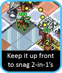 诀窍在于让它保持在后方,并给它足够的空间左右移动。这样你就能轻松地将它移动到合适位置,把关键敌人推到你需要的地方。不过要注意,它相当脆弱,而且无法攻击相邻的格子,所以需要让它远离危险。 建筑免疫升级也非常实用。但要记住,它只能无视建筑……机甲或友军(任何有生命值条的单位)都不在此列。 在战场上