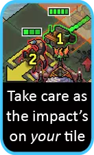 你或许已经发现问题所在了。即便没有受到其他伤害,每一关你能发起的攻击次数也是有限的。要是没有艾贝(Abe),很容易在这一点上损失掉驾驶员。如果你遇到这种情况(或者就是更喜欢其他英雄),还有几个其他选择。第一个是,一旦获得反应堆核心,就立刻提升机甲的生命值,这样能为你争取到更多可承受伤害的空间。第二个是时刻留意能给机甲配备的新武器。这些武器不必花里胡哨,只要能防止机甲攻击到自己就行。 最后一点是,万不得已时,记住你还有修理选项。如果获得了喘息的机会,就使用它。但这真的是最后的手段了。通常来说,升级攻击力并不值得,因为2点生命值的个人伤害会迅速缩短其使用期限,即便有护甲也是如此。但如果由亚伯驾驶,它的基础攻击就能很好地作为主力输出。唯一需要注意的是,护盾会在护甲生效前承受伤害,所以当你发起攻击时,任何护盾仍会消耗掉。 需要提防的一点是,【冲击】地砖的影响范围是在冲锋机甲自身所在的地砖,而非其攻击目标的地砖。你知道当你击中一只 vek 时,它们所在的地砖可能会着火或扬起灰尘吧?而使用这种攻击时,受到影响的地砖会是你自己的。所以如果你的着陆区域有树木,一定要格外小心。