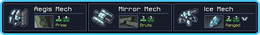 尽管如此,由于冰机甲只能冻结敌人,因此要尽量避开以消灭 vek 为目标的关卡。在冰机甲配备新装备之前,你在这类关卡中很可能难以取得好成绩。不过有趣的是,自身冰冻能力有助于你在需要阻挡出现的 vek 的关卡中表现出色,这至少算是一个优势。 目标要点: 这是那种最终取决于你能获得什么装备的队伍之一。理想情况下,为冰机甲和镜像机甲配备一件替代武器会很不错……前提是你能找到它们。如果找不到,那就专注于提升伤害。可以减少守护机甲的护盾强化,直接追求对敌人造成更大的伤害。 提升所有机甲的移动能力通常也是个不错的选择,因为它们的操作可能比较繁琐。