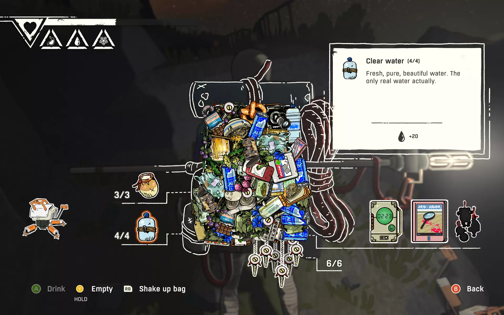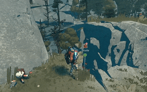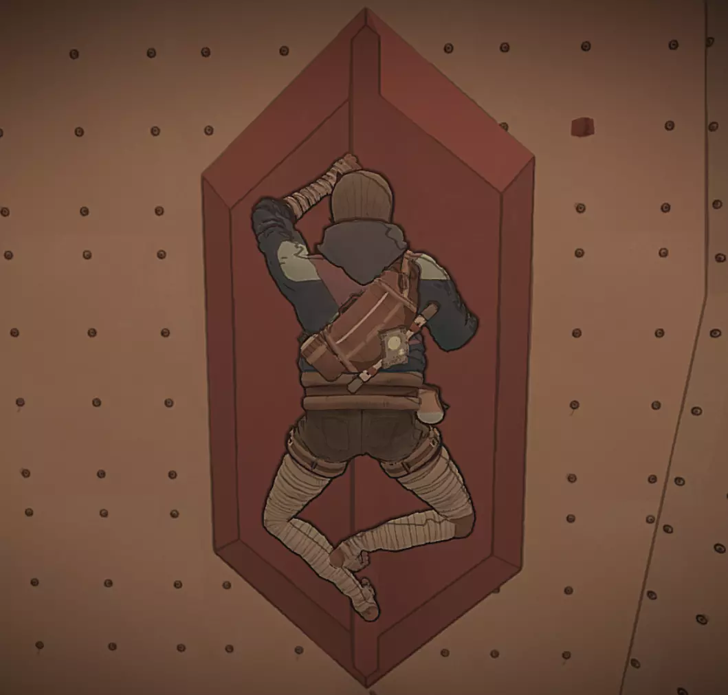 尽管有4个良好的抓握点,仍不稳定 情境修正因素 体力不足或存在其他不良状态(饥饿/口渴/疼痛/寒冷)会大幅降低在困难位置保持稳定的能力,因此要照顾好自己。 在良好位置休息时,体力会缓慢恢复(若激活专注增益效果,则恢复速度更快)。 也可以通过专用输入来少量恢复体力,但使用频率有限制。当你在回到稳定位置前面临体力耗尽的风险时,这是最佳选择。脱离保护或回到坚实地面后,体力会完全恢复。 此外,食物和饮料提供的抓握增益以及镁粉能让原本不稳定的位置变得舒适。镁粉提供的抓握加成是定时抓握增益的两倍,且二者不可叠加。这意味着在抓握增益生效时添加镁粉会有帮助,但抓握增益不会改善当前已涂抹镁粉的肢体。 背包整理 虽然应对有限携带容量的一般最佳方法是“不用就会失去”,但通过正确的技巧,你仍然可以轻松地将背包打包到超出正常容量。不过,这既不是仔细堆叠物品,也不是随意摇晃背包,而是有意地压缩物品。 具体操作方法如下:拿起背包中最大的物品,将其移到其他物品的最上方。然后松开,在物品重新排列以填补新产生的空隙之前立即再次拿起该物品。在这种状态下关闭背包,你现在就有了那个空隙的自由空间来拾取更多物品。每次背包满了都可以重复这个过程,但到了某个时候,关闭背包时物品会稍微膨胀,导致再也装不下任何东西。