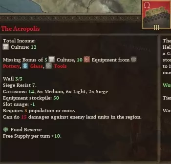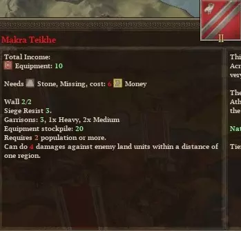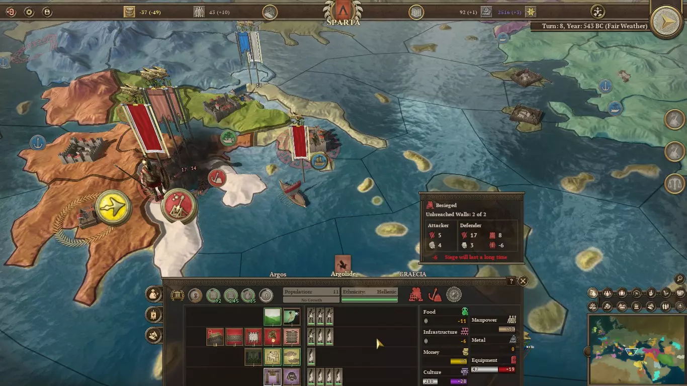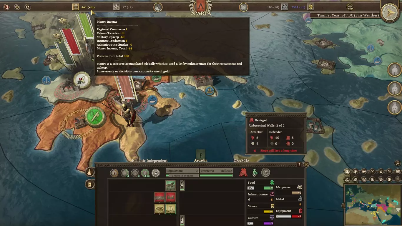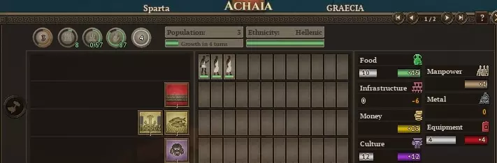 首先,前往亚该亚,让你所有的人口都去生产食物。这里有3个人口,但有4座建筑,这意味着你需要再获得2个人口才能建造任何东西。 这会导致基础设施短缺。不过没关系,如果你不建造任何东西,多余的基础设施是不会被储存的。只能祈祷随机数之神不会摧毁你的任何一座建筑,尤其是那座城墙。(如果有人闯入并占领了这个省份,他们甚至可能会奴役一名公民,那样我们的处境会比一开始更糟。)另一方面,如果商业建筑是无用的高利贷者,那还不如重新开始游戏,因为从一开始随机数之神就不站在你这边。 除了摧毁那个无用的市场,拉科尼亚就交给你管理了。尝试建造更快完工的建筑,但当然要权衡它们的收益,包括解决你当前的任何资源短缺问题。文化方面不需要任何市民。亚该亚的那座神庙从一开始就应该能阻止你在文化衰退率(CDR)排名中下滑。 (注意,首都的人口增长阈值呈线性增长,而其他地区则呈指数增长。这使得在首都以外地区将人口增长到20以上可能不值得费力。因此,最终你会希望将拉科尼亚专门用于人口增长。这意味着在游戏初期建造粮食建筑,而在后期用卫生建筑替换它们,以最大化健康值。)这是在你建立希腊行省之后,该省内的各区域可以共享资源。将其中一部分资源用于向首都大量输送粮食。 接下来是军事方面。阿尔戈斯很可能会将军队主要用于保卫其首都,或许是担心一旦斯巴达决定出兵,自己会被斯巴达的力量击溃。那就让情况保持这样。不要削弱你的军队,以免让他们产生其他想法。 不幸的是,你最初的军队远不足以彻底击败阿尔戈斯。因此,你的目标应设定为北方的区域。不要拖延,否则它们很快会被维奥蒂亚同盟夺走。在你的第一回合,招募足够的奴隶,呃,希洛特持盾兵,用满编8个支援单位来扩充你的队伍。确保你的军队由攻击值最高的将军率领。然后等待下回合将阿卡迪亚设为目标。 下回合率领你的军队直接进攻阿卡迪亚的城市。出于某种原因,整支守军会主动出击,在开阔地带与你交战。击溃他们。这比等待围城结束要容易得多。如你所见,围城等级为-6,意味着围城永远不会取得进展(除非你掷出10点并攻破城墙,但之后你仍需攻破另外两层城墙)。