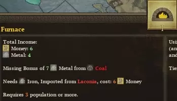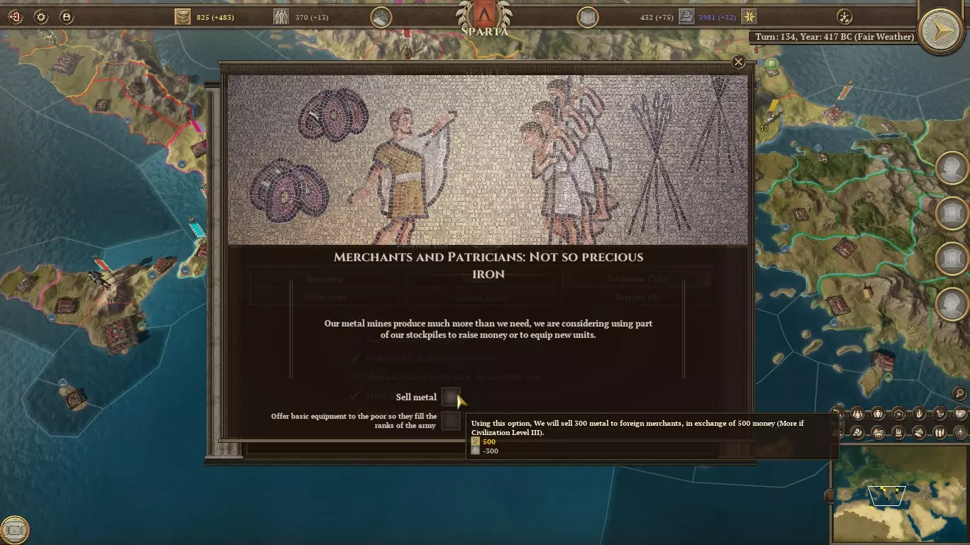 至少在斯巴达,你不会缺乏金属资源(不像雅典人需要殖民伊利里亚来获取铁)。多余的金属可用于外交交易,以促进合作协议的达成。或许在后续回合中,这还能让你交换其他资源,甚至领土。或者,当相关决策出现时,你可以选择将其出售,换取500金币或300人力。