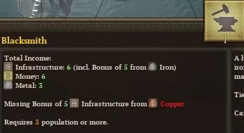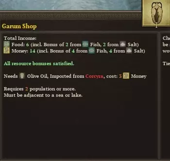 食物和金钱?听起来正是一个年轻沿海国家所需要的!不过要确保你能获取鱼类资源。希腊地区通常已经存在一到两座渔场,以补充自然生成的鱼类资源。(否则拉科尼亚将没有鱼类,所以你可能需要转而建造其他更有利可图的建筑,除非你想浪费回合重新刷新建筑直到获得大量鱼类)别忘了建造配套的盐矿和油坊。 另外两座可以考虑建造的建筑是熔炉和铁匠铺。熔炉会进口拉科尼亚的铁矿作为铁匠铺的额外资源,并且作为希腊国家还能产生可观的25%额外贸易收入。