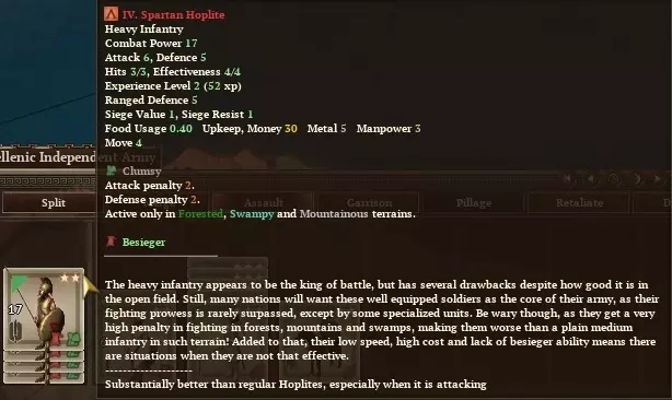 斯巴达重步兵拥有6/5的攻击/防御属性,比标准希腊装甲重步兵的5/4属性各高出1点。 你可能会问,什么是效能值?为什么我们的重步兵有4点效能值,而其他希腊重步兵只有2点?其实,部队的效能值加上经验等级,决定了战斗中骰子的最小点数。由于斯巴达部队在这两项上都数值较高,因此他们的骰子点数总能保持在较高水平。毕竟,斯巴达的军事优势源于我们的精湛技艺,而非寄望于运气。