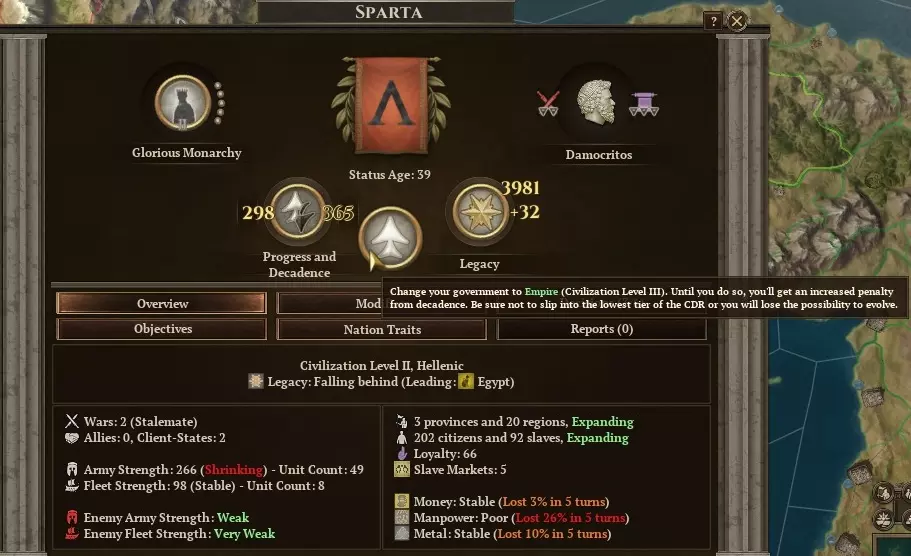 之后当你建造更多奴隶市场时,这个数字可能会变得相当可观(见上文)。但建造多个奴隶市场绝对不是优先事项!除非你确实需要它们将战斗中捕获的奴隶转移到其他地区。 还有一个决策允许你决定奴隶权利。如果斯巴达拥有任何政府建筑(无论是总督宫殿还是演说 tribune 系列建筑),那么你最好释放一些奴隶。记住,奴隶不贡献税收或人力。你肯定不希望他们出现在你最富裕和人力产出最高的地区之一。建立年轻的斯巴达帝国 游戏早中期的大部分目标都将围绕着一件事展开——达到文明等级3,并重组为第一斯巴达帝国(以开创一个更安全稳定的未来)。不要低估成为帝国的益处,这将从根本上改变斯巴达的战争方式。如果你成功做到了,那值得欢庆,因为这是此前任何一位斯巴达国王都未曾实现的功绩。 我必须强调,改革这些历史悠久的斯巴达传统是一项多么重大的事业。这将彻底让我们摆脱过去的束缚,去对抗强大的波斯帝国这一巨大威胁。当然,要与一个帝国势均力敌地抗衡,或许自身也必须成为一个帝国,以便能够动用唯有帝国才能调用的所有资源,集结唯有帝国才能召集的一切民事与军事机构。