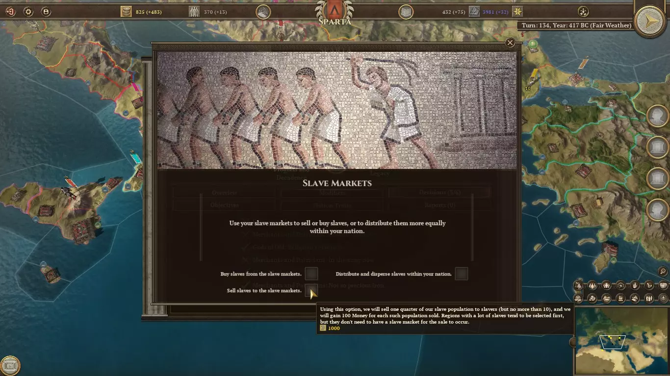 拥有10点攻城抗性和驻军免费食物供应,想要攻下这里可不容易。更不用说雅典的海军在海上巡逻,使得海上封锁也毫无希望。尤其考虑到他们在文明等级2时就能建造重型战舰。如果仅从陆路攻城,你大概需要30个边民部队才能扭转攻城抗性的劣势,但即便如此,你也得花费大量回合等待每层城墙被攻破。这些时间还不如用来在陆地上作战以建立帝国。 所以我们陷入了僵局。雅典因为我们的重装步兵驻军而无法在斯巴达首都登陆,而我们也因为他们的舰队而无法将他们困死。一方是陆地的主宰,另一方则是海洋的霸主。所以每次我们展开激战,雅典人都能夺取我们任何未设防的海岸,而我们则夺取他们所有在行军距离内的殖民地。经过数年的战斗,我们会统计谁赢得了更多战役、占领了更多领土,并要求失败者交出他们的遗产点数。 从中得到的教训?战争期间不要殖民岛屿,也不要走海路。 此外,雅典和斯巴达之间还存在着古老的竞争关系。优势通过比较以下三个方面来衡量: - 海军力量 - 地区数量 - 遗产点数 要在任何一个方面取得优势,你需要领先对手1.5倍以上。拥有更多占主导地位的方面将触发事件,为获胜方提供奖励,例如: - 额外的基础设施点数 - 额外的文化点数 - 与其他希腊派系的关系改善 - 奴役战败方的人口 - 获得额外的将领 - 提供额外的区域决策 雅典的舰队几乎肯定会一直压制我们不存在的海军。而且从一开始,我们的遗产得分就势均力敌,双方都无法获得明显的领先优势。因此,要保持足够快的领土扩张速度,确保我们至少拥有同等的主导地位,以避免遭受惩罚。在游戏后期,当你在传承方面早已超越雅典之后,即便你已能组建强大舰队挑战雅典,让雅典继续存在或许仍然有用。时不时获得一名免费将领和一名免费奴隶,似乎也不是什么坏事。 管理所有这些奴隶 坦白说,斯巴达存在奴隶问题。纵观历史,仅在斯巴达首都,希洛人(Helots)的数量就比斯巴达公民多10倍。因此,斯巴达确实没有足够人力长时间在远离家乡的地方部署军队,因为担心奴隶起义。这意味着,每当我们的首都人口增长时,有一定几率增加一名奴隶而非公民。 要解决这个问题,我们需要建造【奴隶市场】。任何地区都可以,不一定非得在我们的首都。完成后,以下决议会偶尔出现。在游戏初期,出售多余的奴隶换取黄金或许是最佳选择。请注意,即使只是出售奴隶,你至少需要500金币才能点击该决议,所以尽量不要把国库完全清空。无论如何,500金币能为任何紧急情况提供良好的缓冲。奴隶贸易带来的额外收入来源肯定有助于维持这一缓冲。