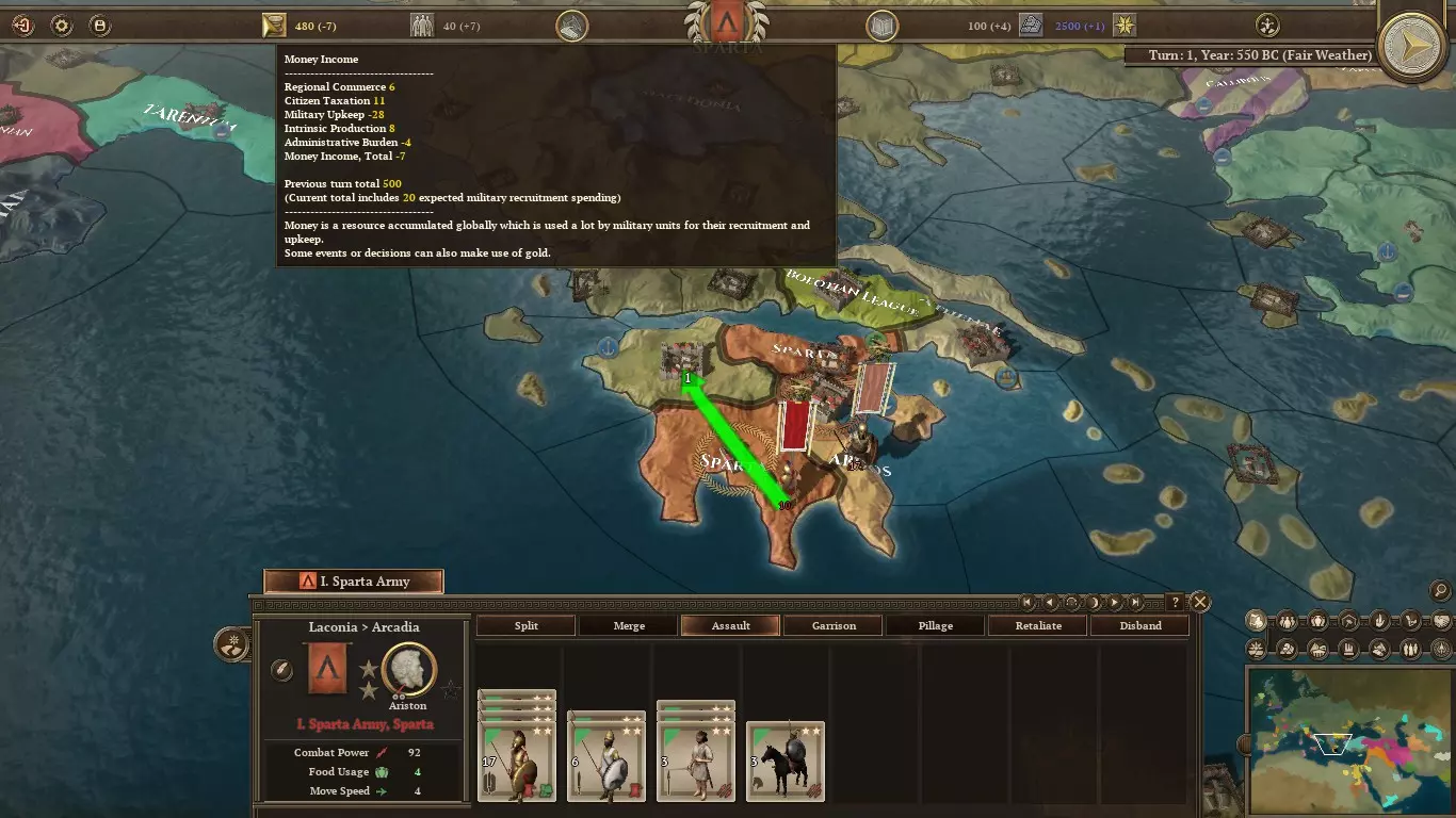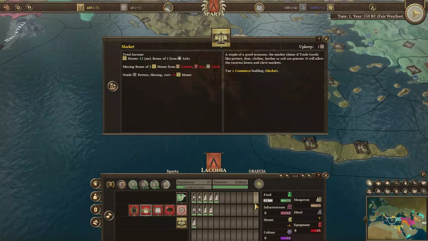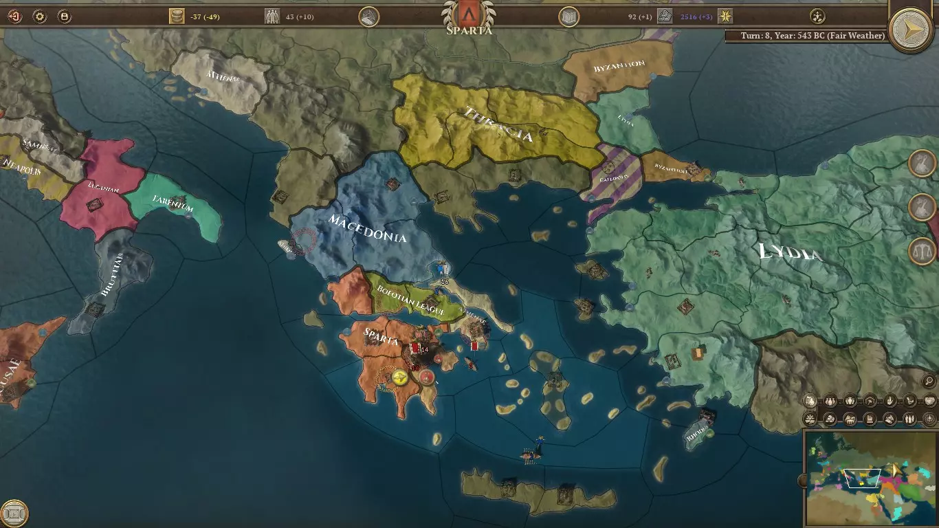 按照这个速度,斯巴达将在10回合内破产。正好赶上与雅典的战争,哈哈。这里涉及几个机制: - 首都的军队维护费用降低25% - 经验丰富的单位会增加金币维护费用 - 10支部队还将获得免费维护 - 部队免费维护上限为每支15金币 因此,当你的部队驻扎在斯巴达时,那些2星、维护费用30金币的重装步兵实际每支只需花费(22-15)=7金币。但在其他任何省份,它们每支将花费15金币。随着部队获得更多经验,情况只会变得更糟。而且当你招募超过10支部队时也是如此。 尽管在历史上,斯巴达军队很少冒险走出伯罗奔尼撒半岛,但显然让部队待在家里并不能解决这个问题。我们需要做的是发展我们的经济。同时,在你破产之前,或许应该将一些市民转为商人。假设重装步兵属于你的免费维护单位,而边民步兵则不属于。每招募一名二星士兵加入军队,你都需要支付15金币的维护费用。这意味着每增加一名新步兵,就需要2.5名商人来支持!我不知道你怎么想,但我看到斯巴达只有6名市民……