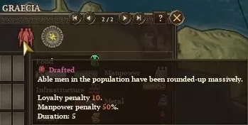 这种临时的部队增益可以用于补充我们的战斗预备队,或是快速提升攻城等级以加快攻城进度。因此,如果你手中有额外的【征召边民】决议,在和平时期可以放心解散一些不需要的部队。 如果你对自己的重装步兵赢得战斗有十足信心,一种特别有趣的军事策略是在主战线只部署4到5支重装步兵。这样就为边民留出了加入战斗的空间,而他们的唯一目的就是在战斗中失利。这会导致战斗初期回合整体战术平局,从而阻止战斗进入追击阶段。这能让你延长交战时间,以便在后续回合对敌军造成更多伤害。尽量不要征召来自斯巴达的这些炮灰。不是因为描述中警告他们无法获得经验,而是你不会希望自己整个国家中唯一能产出优质人力的城市受到【征召】修正的影响。
