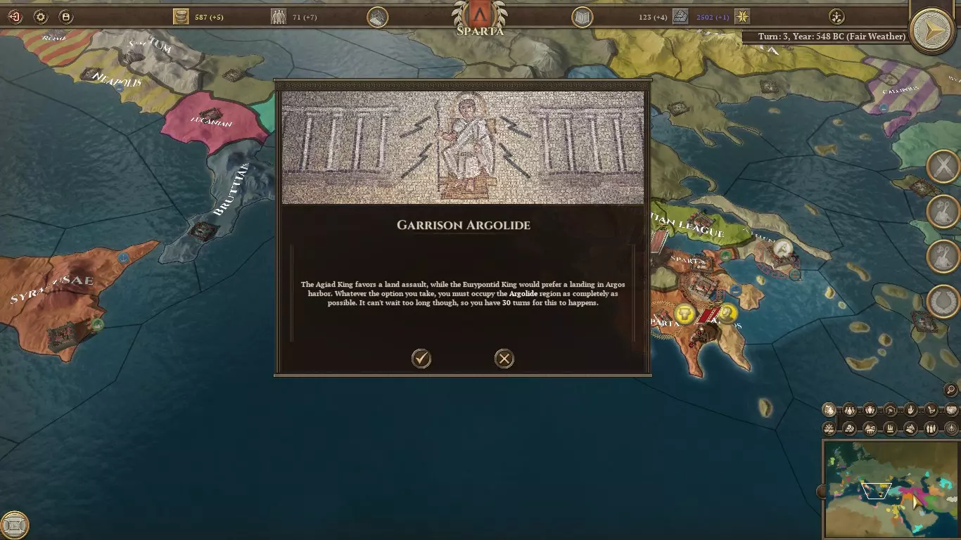 完成后,等待将更北边的阿卡纳尼亚设为目标并征服他们。如果你确实想的话,可以围攻他们,但我认为斯巴达没有理由等待,应立即将这些独立的希腊城邦纳入我们的保护之下。 至此,所有力所能及的独立城邦都应已被处理。其余的城邦很快会被维奥蒂亚同盟或马其顿占领,他们非常乐意看到斯巴达被孤立。(至少我们不像维奥蒂亚人那样腹背受敌。)现在准备围攻阿尔戈斯吧。