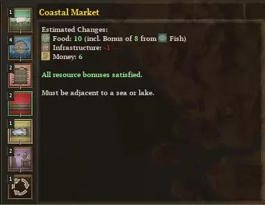 好了,是时候解决我们的现金流问题了。看到拉科尼亚的那个市场了吗?拆掉它。不,我不管它因为有盐资源而能实现收支平衡(通常情况下都做不到)。它仍然会消耗你1点基础设施维护费,但更重要的是它占用了一个建筑槽位。而且,一百年来都没人在生产陶器、皮革、染料和布料。 你应该建造这些东西来替代它: