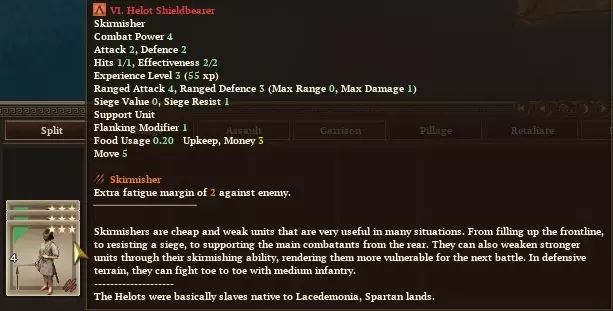 与攻击/防御为4/3的雇佣重装步兵相比,边民步兵(Perioikoi)虽然少了1点攻击力,但多了1点生命值作为弥补。不过他们肯定无法与装甲重装步兵抗衡。最好将其留作预备队,以便在战斗持续超过1回合时填补缺口,让受伤的重装步兵能够轮换休整。希洛人(Helots)构成了我们的远程部队。作为奴隶,他们是炮灰部队,且无需消耗人力维护。