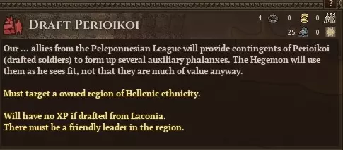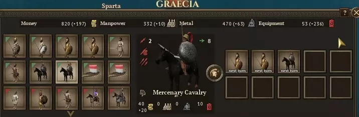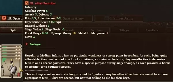 好吧,至少你能获得更高的最低骰点,而且敌人必须打掉所有3点生命值才能消灭一名重步兵,这一点或许能让你稍感安慰。 另外,注意最左侧和最右侧前线的绿色方块了吗?那些方块是骑兵专用的。如果你没有骑兵,敌人的骑兵就会对你的部队造成侧翼伤害。被侧翼攻击可不是闹着玩的,甚至可能一击消灭我们的重步兵。所以,在陷入大规模冲突之前,最好建造一座马厩来避免侧翼暴露。(作为临时措施,如果你控制了马其顿行省的任何区域,可以通过决策招募当地部队来获得2支轻骑兵。消耗100点传承点的紧急征兵决策也能提供2支骑兵部队。) 总结一下。基本上,斯巴达军队在战斗中相较于其他军队的唯一优势就是更高的最低骰子点数。你并非无敌。不要去寻找那些你无法取胜的战斗(尤其是不要让你笨重的重装步兵在山地地形作战!)。不要让带着2-0将领的军队在野外无驻军设防,从而遭到攻击。 重装步兵有3点生命值,尽量不要让他们阵亡。你会失去已获得的经验等级,而且招募他们需要花费大量黄金,尤其是当你拥有庞大军队时,他们的招募成本会迅速增加。如果你需要不止一支精英军队四处征战,或许只应让重装步兵部署在前线。 幸运的是,斯巴达在战争时期还有最后一招。毕竟,伯罗奔尼撒联盟并非只有斯巴达。所有希腊盟邦城市在需要时都可被征召为步兵后备力量,呃,炮灰。只需进军他们的城市并要求他们拿起武器,他们就会在下一回合加入你的军队。(快速访问区域决策的方法是按【R】键)