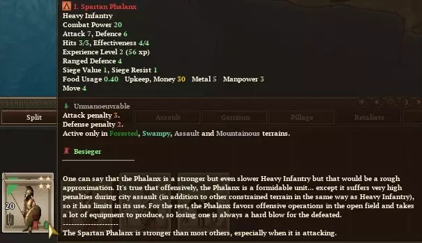 但这还不是全部,阿戈戈制度还意味着我们首都每新增人口都有概率成为奴隶(奴隶不会提供人力和税收),而非公民。嘿,这对帝国建设可不是什么好兆头。 看看你首都拉科尼亚的人力状况吧。即便有军事学院和兵营提升人力,其提供的人力也仅勉强达到其他派系的一半。 至少斯巴达军队的质量能弥补这一点,对吧?嗯,事实并非如此…… 军事对比 幸运的是,斯巴达步兵消耗的人力比其他派系少。精英斯巴达重步兵消耗3点人力,而来自我们统治下其他城市的庇里阿西人仅消耗1点。