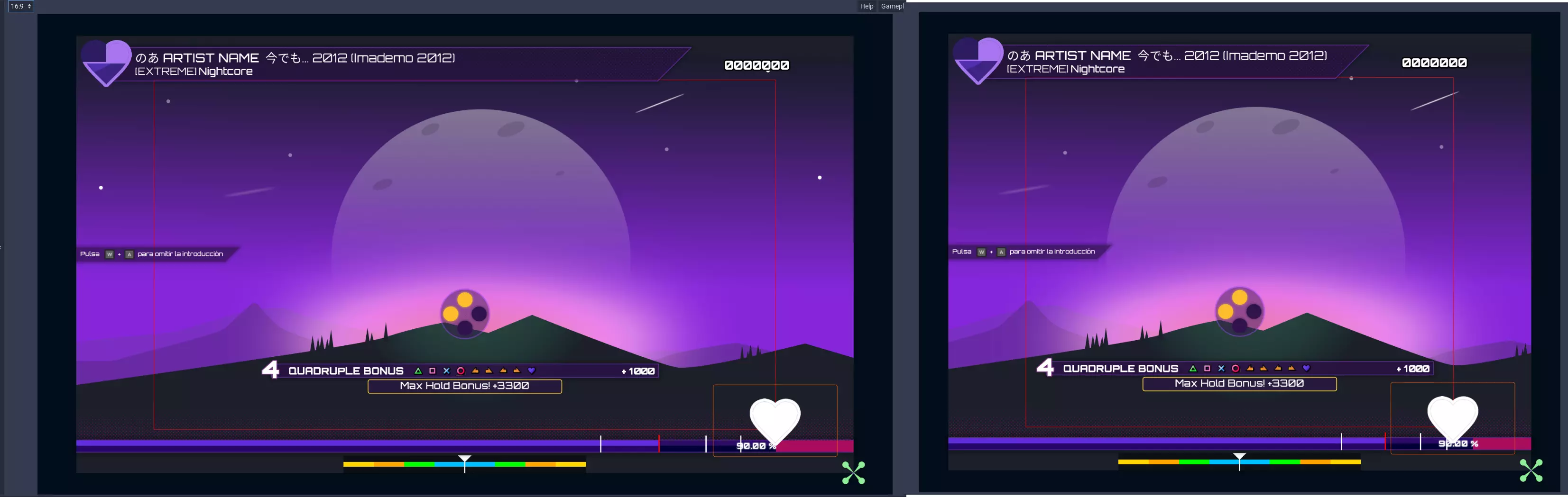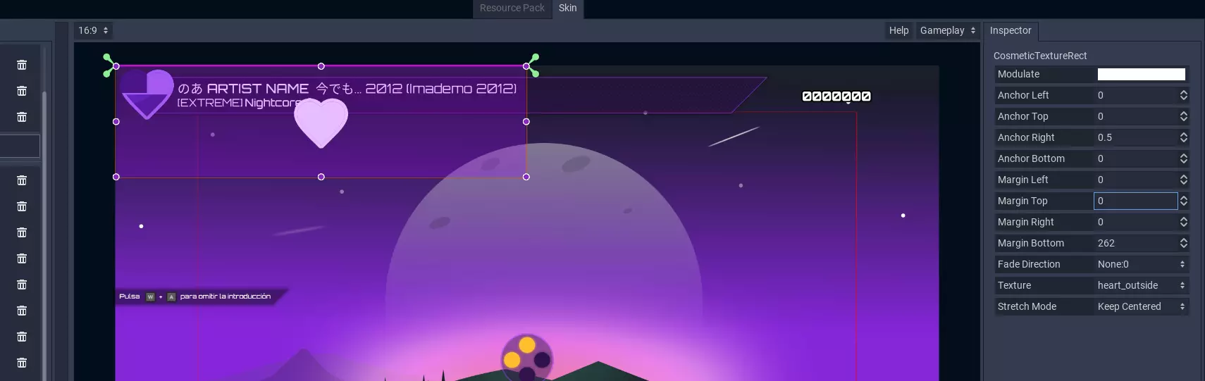组件选择器是用于选择要创建的UI组件的工具,你可以拥有多个相同类型的UI组件,因此建议你多进行尝试。 资源管理器(显示在左侧)是添加和移除不同类型资源的地方,例如字体、纹理甚至动画纹理。 宽高比选择器与其他节奏游戏不同,PH可以适应不同的屏幕尺寸,这使得该按钮成为非常重要的工具。它能让你测试皮肤在多种常见宽高比下的显示效果,如果皮肤能良好适配列出的三种宽高比,那么它很可能适用于其他所有情况。请测试不同的宽高比,以便所有人都能享受你的界面!场景 场景是放置组件并设置其锚点的地方。橙色方框代表组件的实际最终位置(移动它会改变边距),绿色箭头代表其锚点。你可以在本指南的锚点系统部分了解更多信息。这是让用户界面能够适配不同宽高比的关键部分。 屏幕选择器 目前你只能自定义游戏内用户界面,但未来游戏可能允许自定义其他屏幕。如果有那一天,你可以使用此功能来切换它们。 检查器 检查器会显示当前选中组件的各种属性。你可以使用它来自定义组件,例如选择纹理、字体、颜色、样式框(稍后会详细介绍)以及其他有趣的内容。锚点系统 皮肤系统的核心在于锚点系统,它决定了游戏中每个组件各个角的起始位置。 锚点系统使皮肤能够轻松适应不同的屏幕宽高比。 每个用户界面组件的每个角都有一个锚点值,该值是屏幕的百分比,以0.0到1.0之间的数值表示,这些值在视觉上表现为指向各个角的绿色“箭头”。 此外,每个组件都有一个“边距”值,用于相对于锚点位置偏移其各个角。此边距值在视觉上表现为围绕组件的橙色矩形。