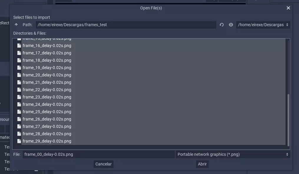 设置纹理名称后,你可以通过按住Shift键+点击或Ctrl键+点击的方式,选择多个PNG文件作为动画纹理的来源。