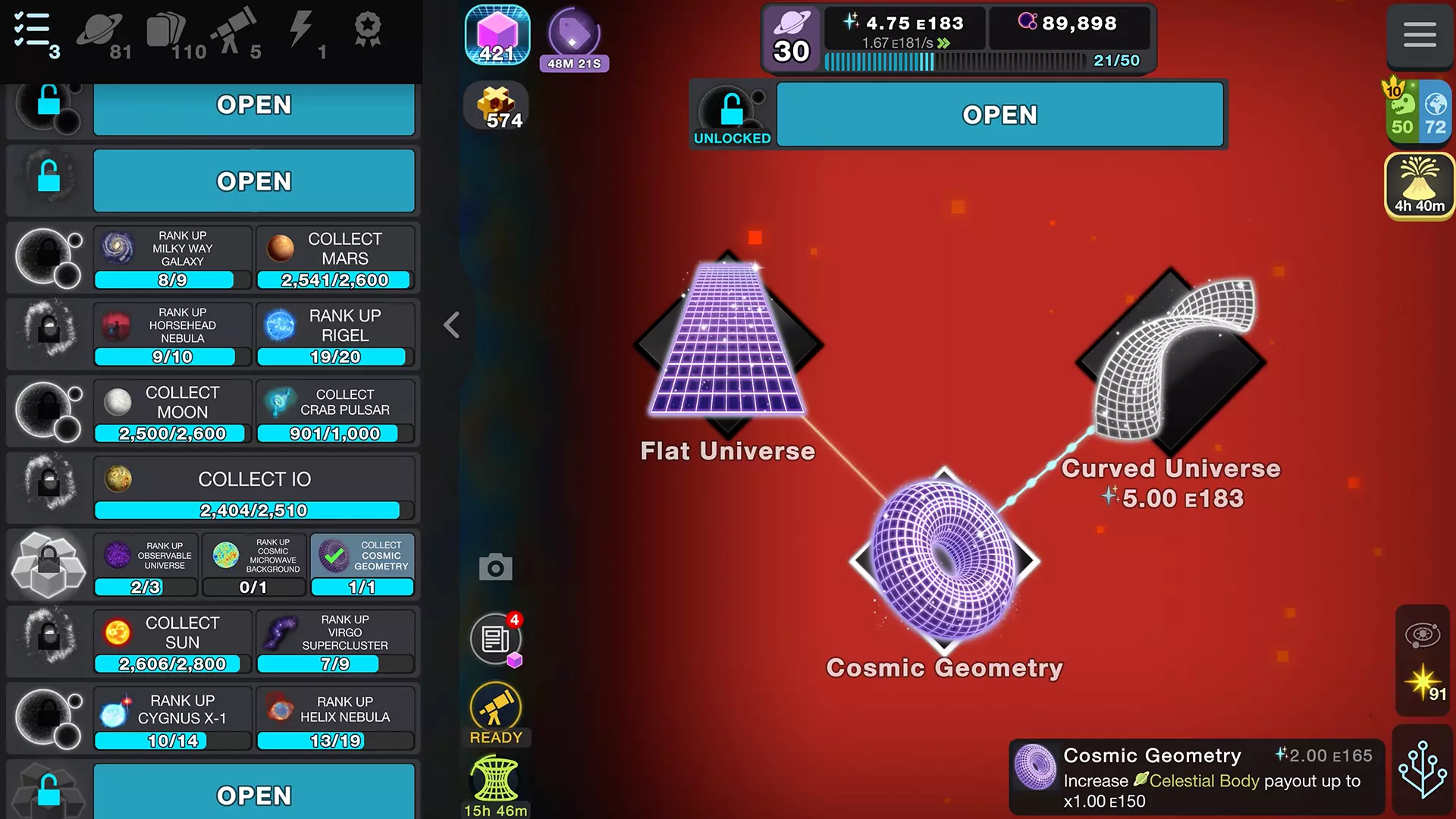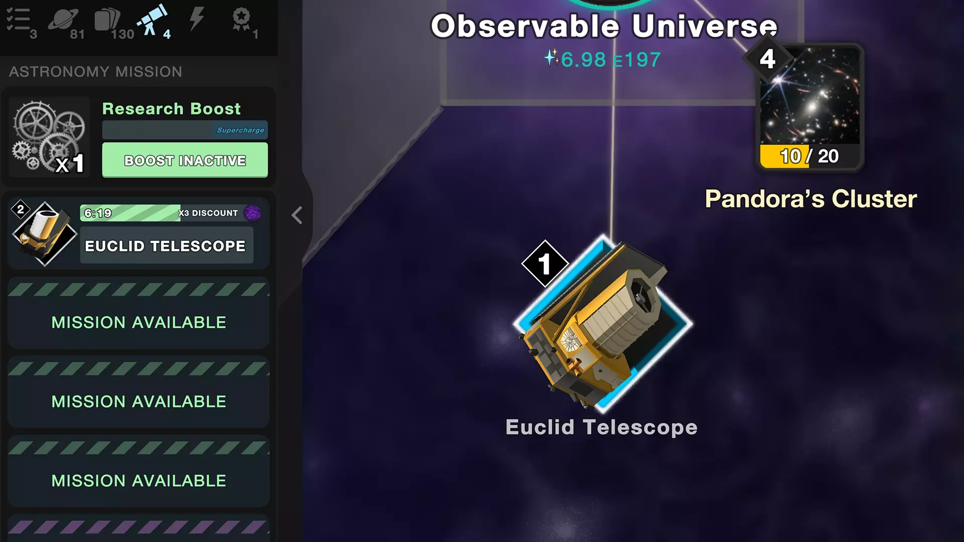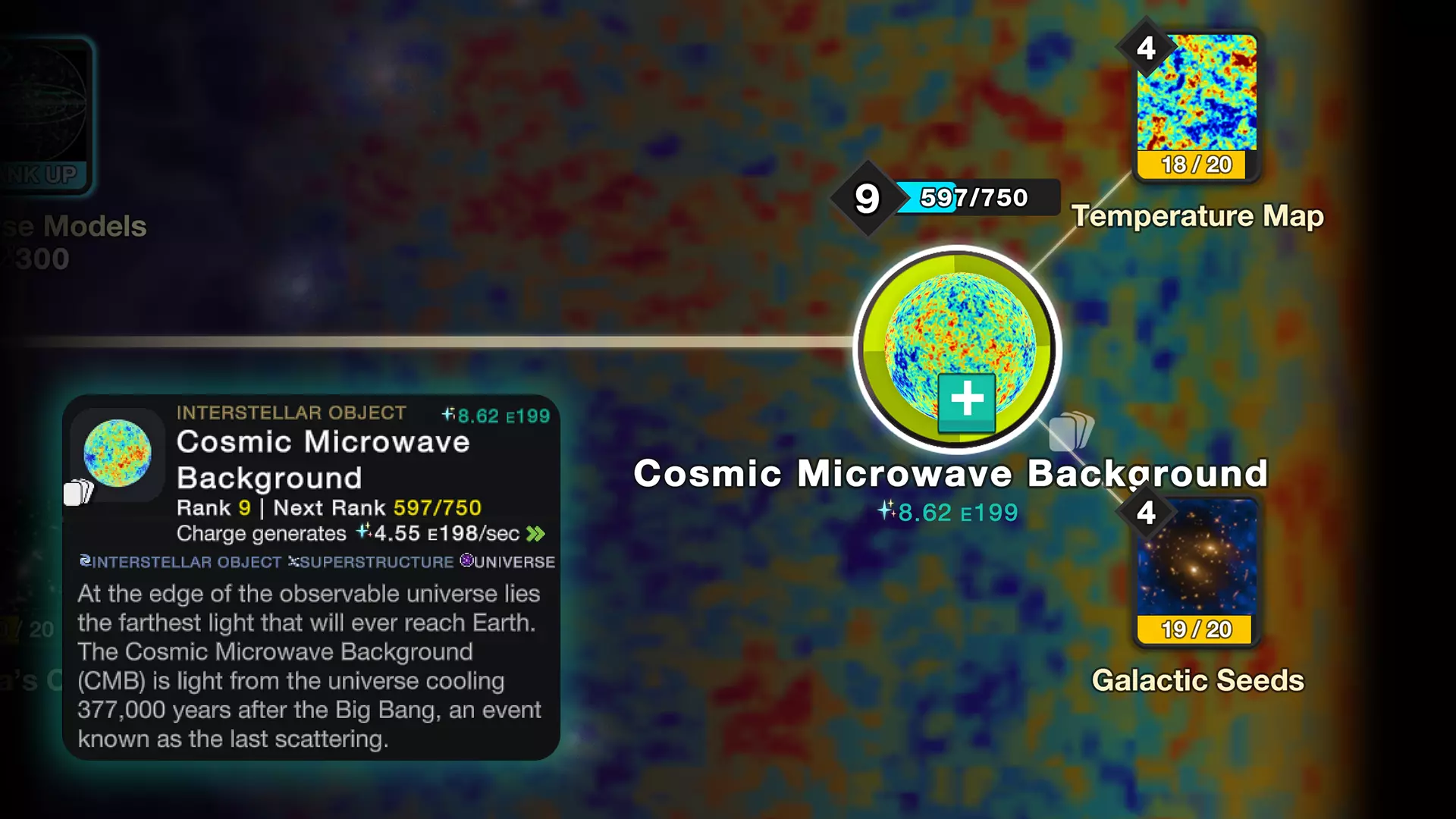 终末之始 光已行至其所能抵达的最远处。在我们可观测宇宙的地平线之外,那片最黑暗的虚空之中究竟存在着什么,完全是一个谜。你是否有足够的勇气与表象一同冒险前行? 用四张具有启发性的特质卡照亮你的道路,例如潘多拉星团和银河种子 解锁两个超乎想象的生成器:可观测宇宙和宇宙微波背景 通过七个可收集的奖杯节点,推测宇宙的形状以及更多未知