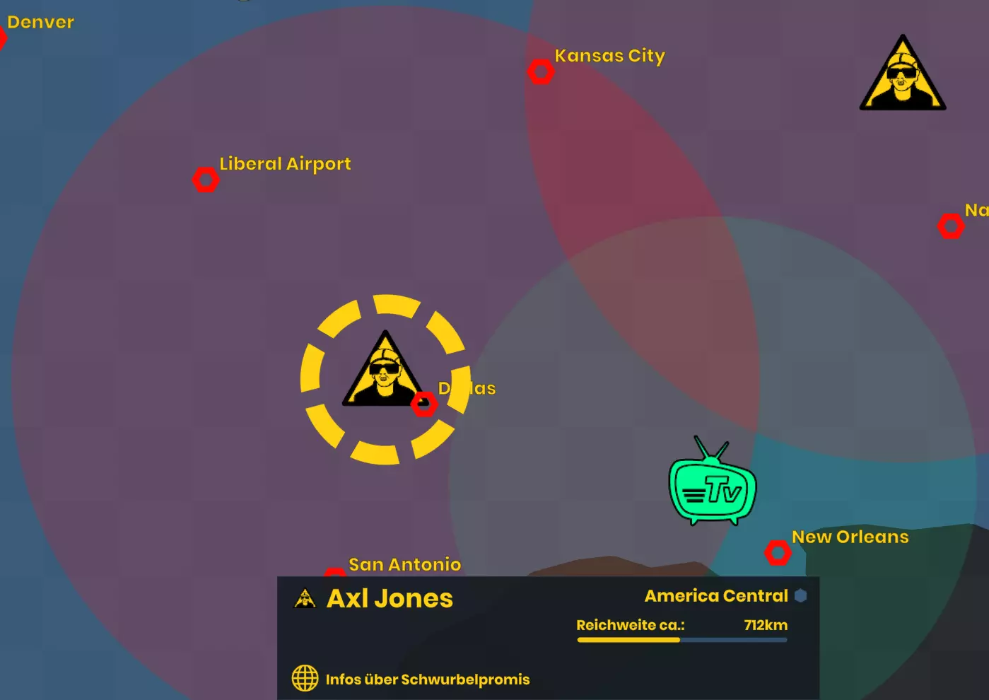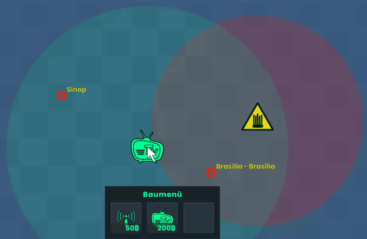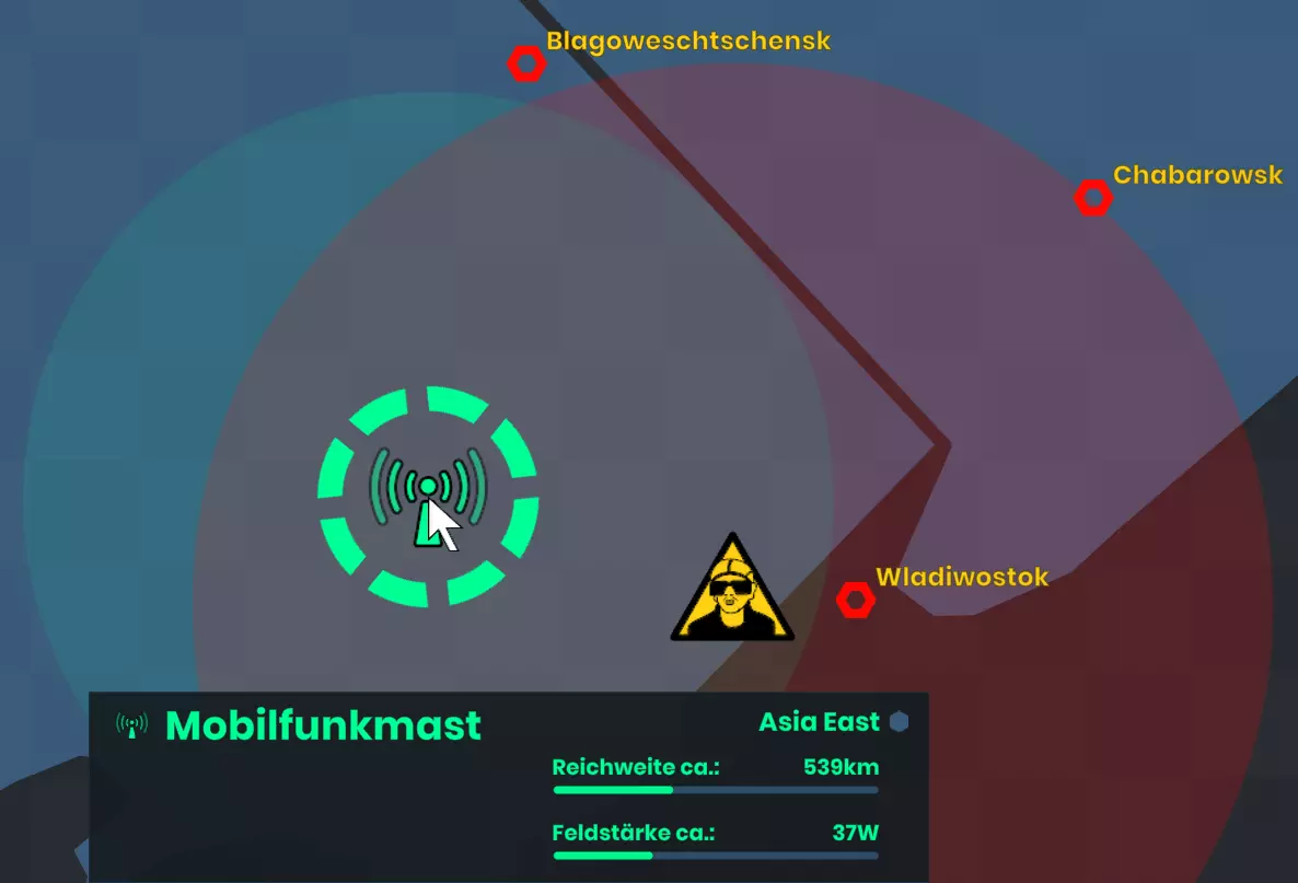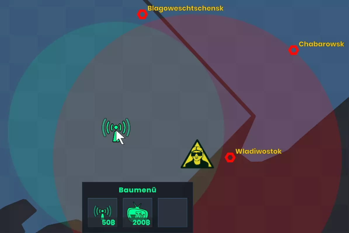 点击任务栏中的建筑工人图标以打开建造菜单。在该菜单中,你可以选择建造移动通讯基站或【NWO-Lügenpresse】的媒体机构。它们只能放置在陆地上。如果你改变主意,可以右键点击取消放置。 移动通讯基站