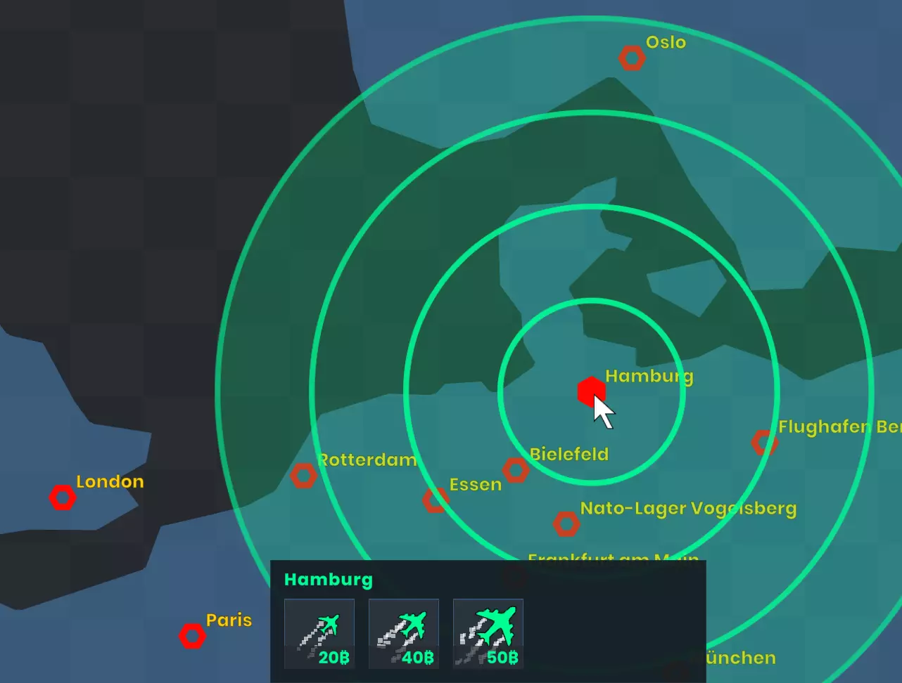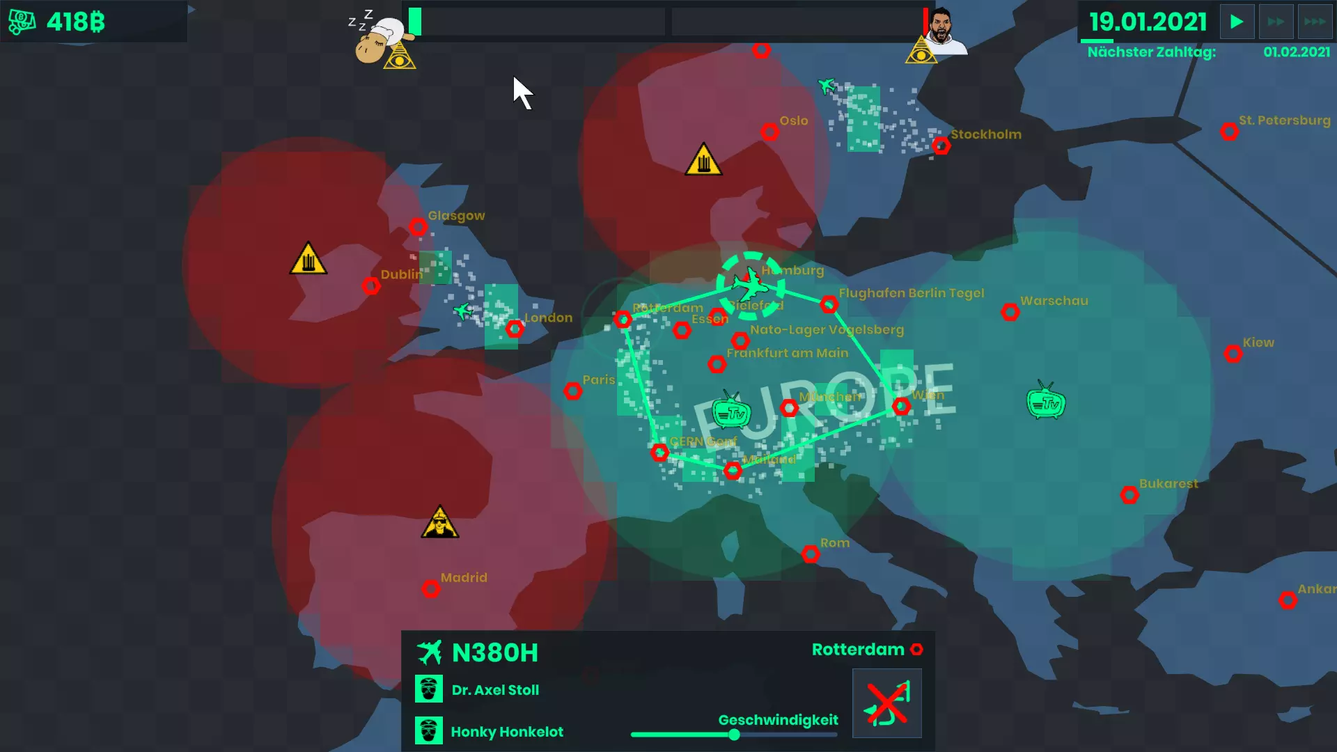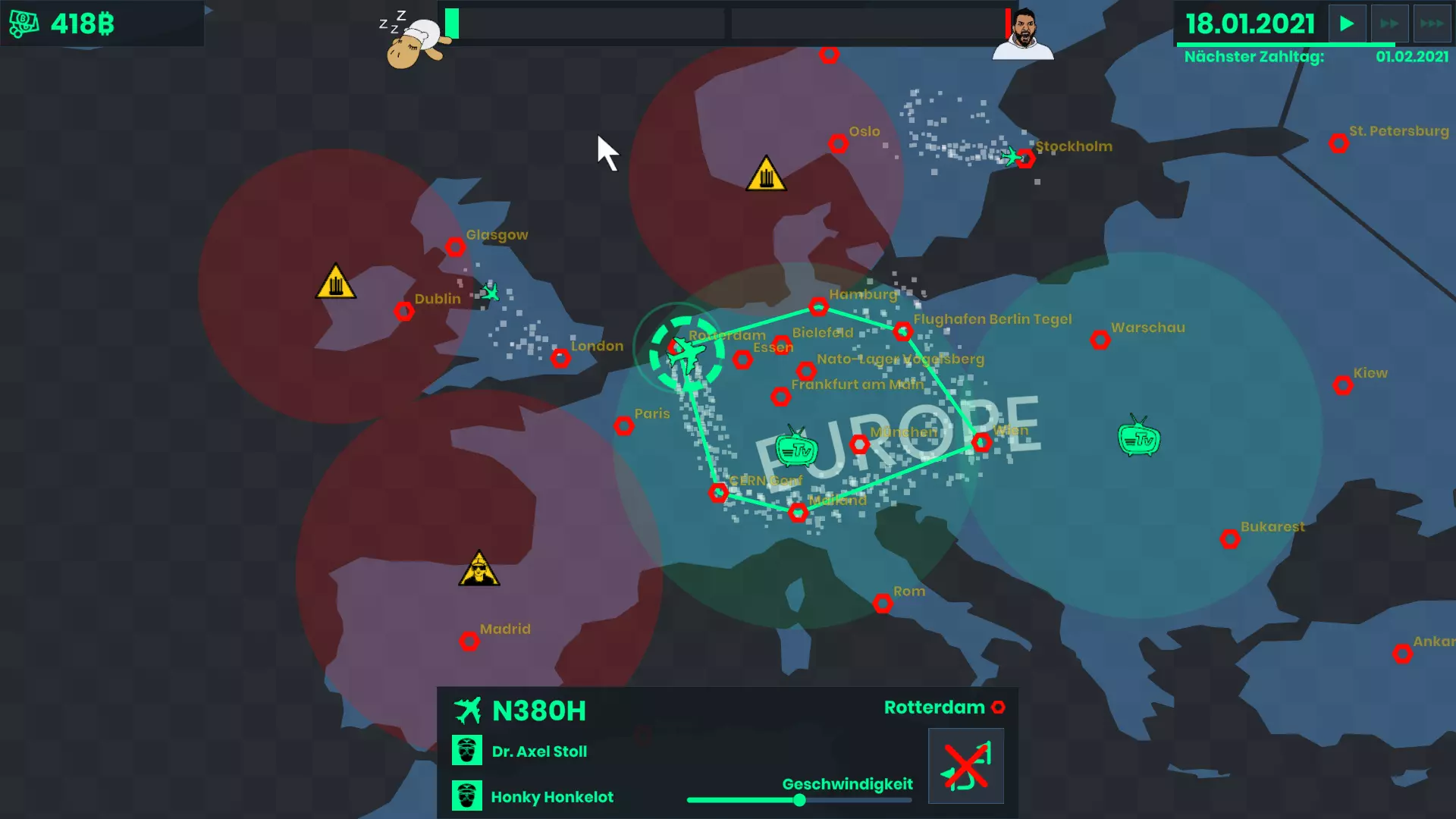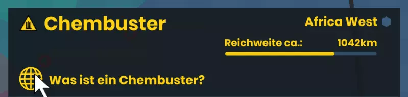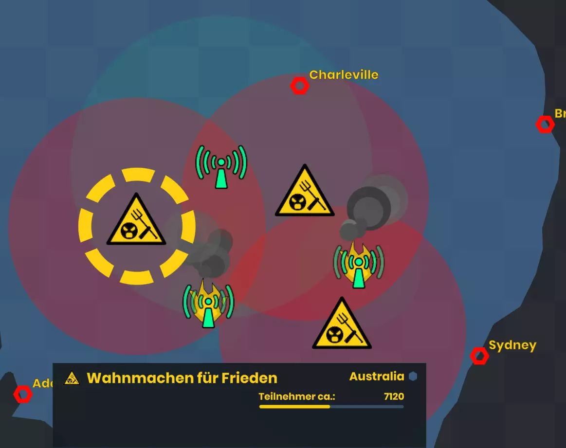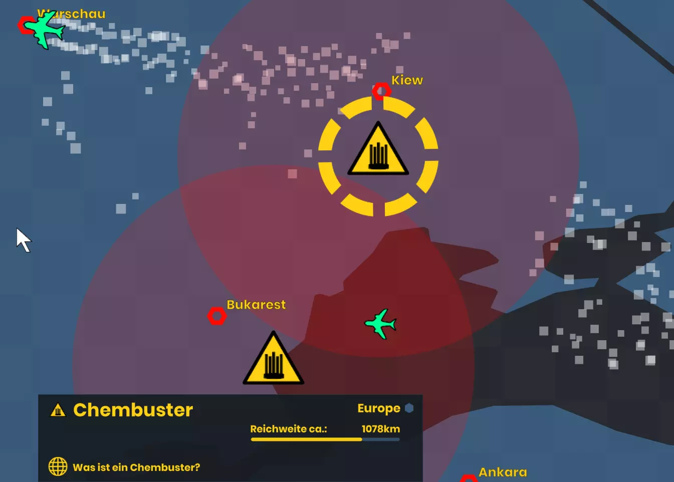 世界地图上所有的六边形都是机场,你可以点击它们。如果预算允许,你可以从那里起飞化学尾迹飞机。化学尾迹飞机的覆盖范围相对较大,对愤怒市民的示威活动效果非常好。不过,你的化学尾迹可能会被化学破坏装置干扰和消散,这会严重影响其效果。飞机