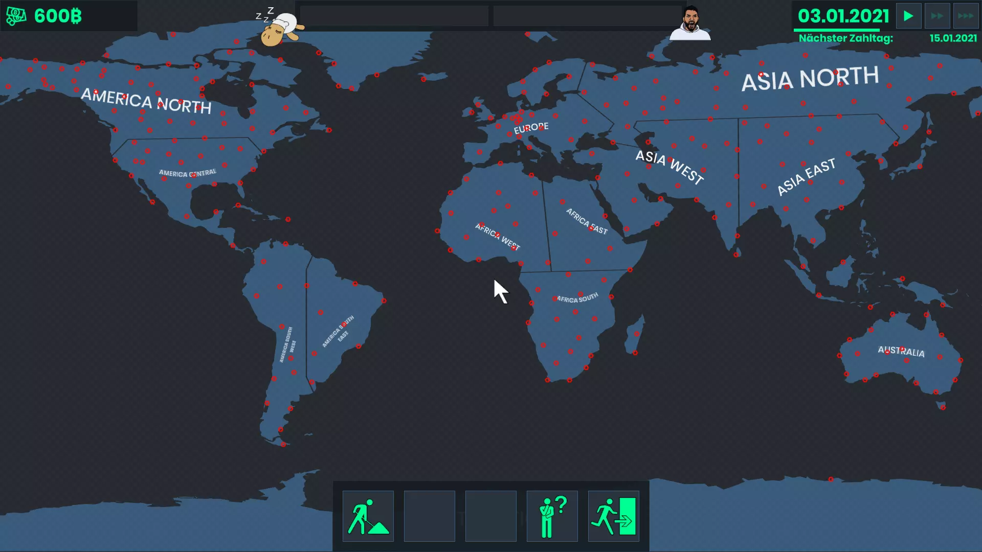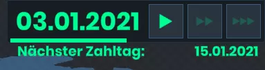 当前日期。在这里你可以选择三种不同的游戏速度。当你打开主菜单时,游戏会暂停,你可以去洗手间或稍作休息。日期下方显示的是下次结算的时间。任务栏