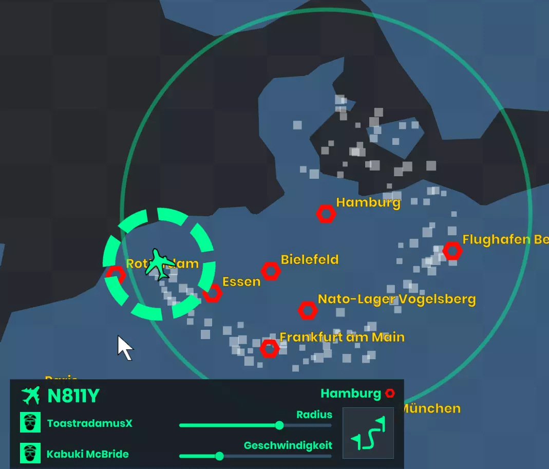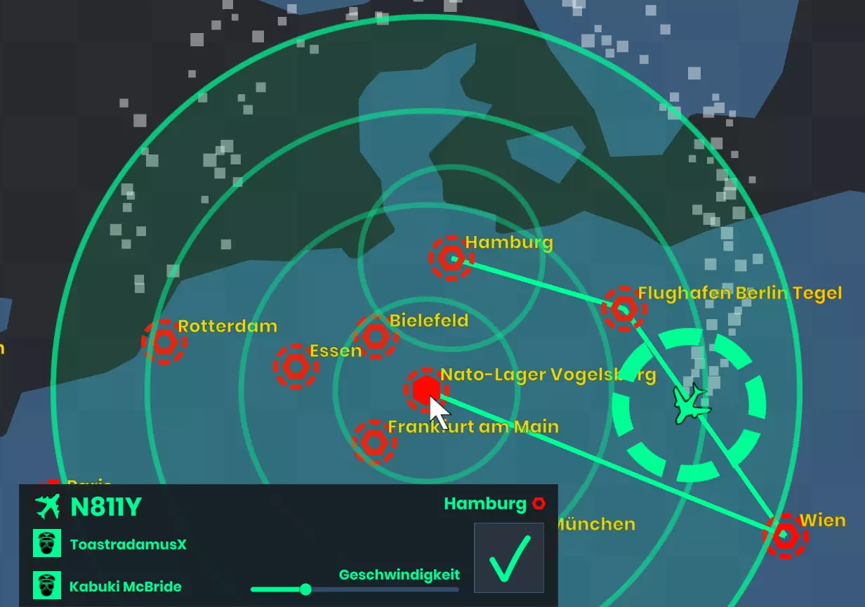 每架飞机都有一个固定的所属主机场。你可以让飞机绕机场盘旋,或者创建航线。飞行速度会影响凝结尾迹的密度。航线